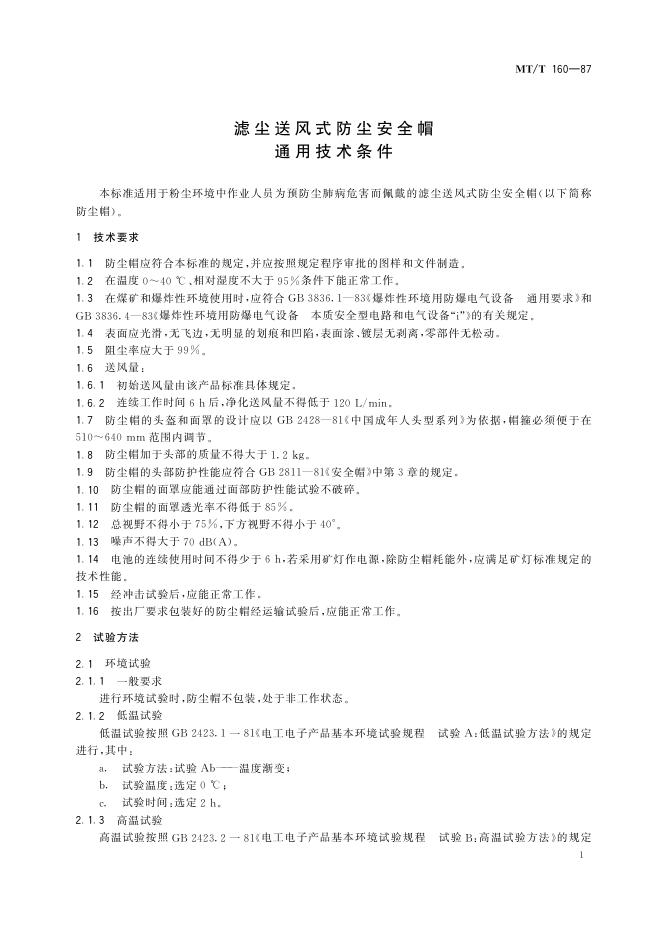 MT/T 160-1987 滤尘送风式防尘式安全帽 通用技术条件