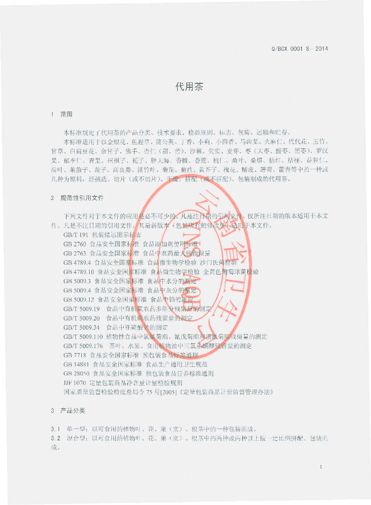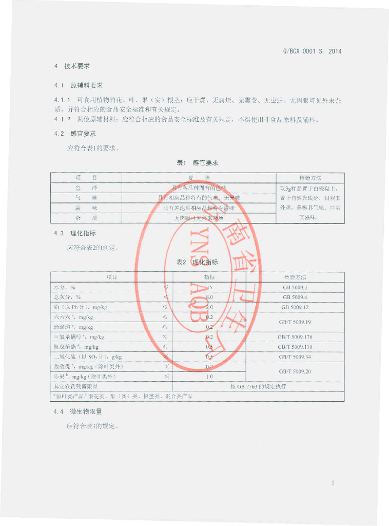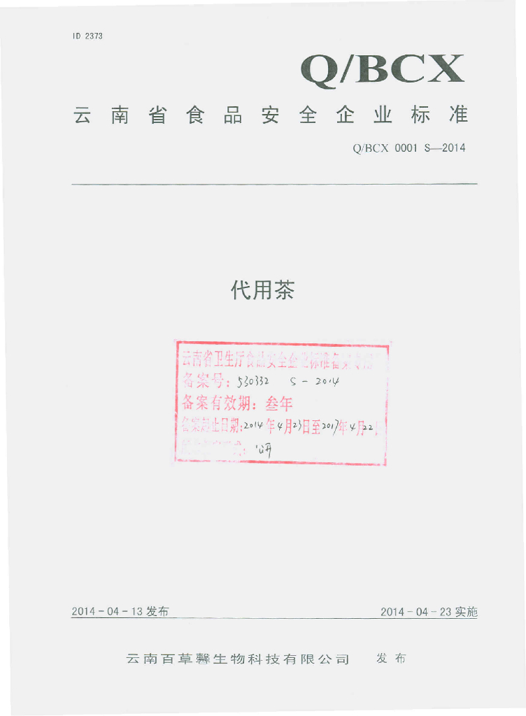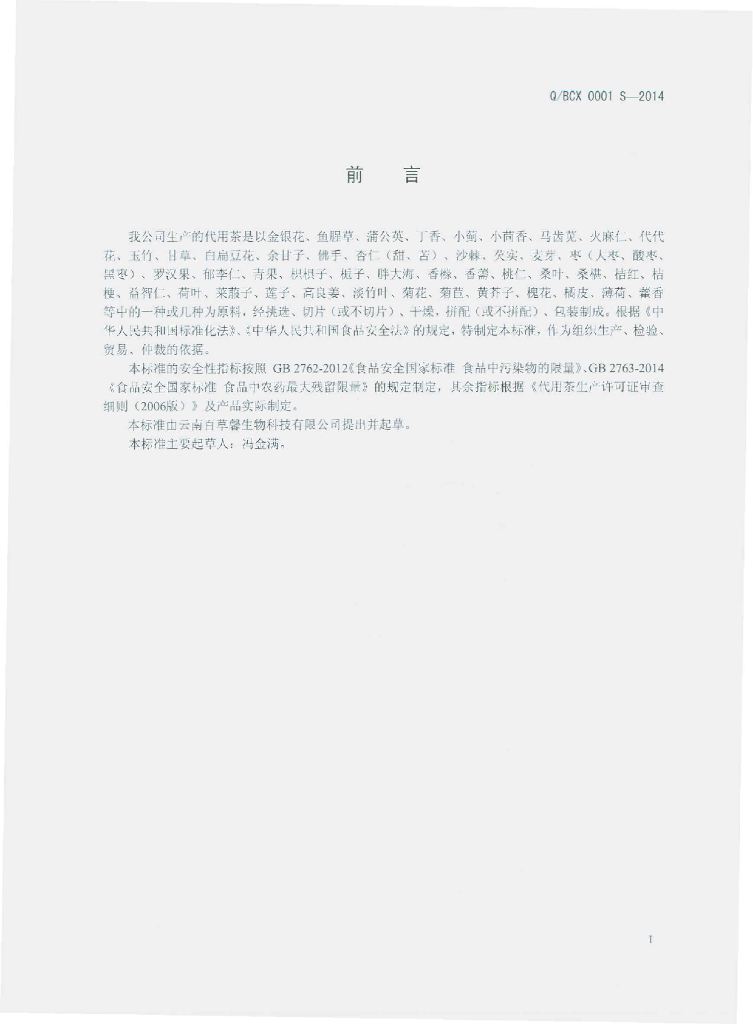 Q/BCX 0001S-2014 云南百草馨生物科技有限公司 代用茶