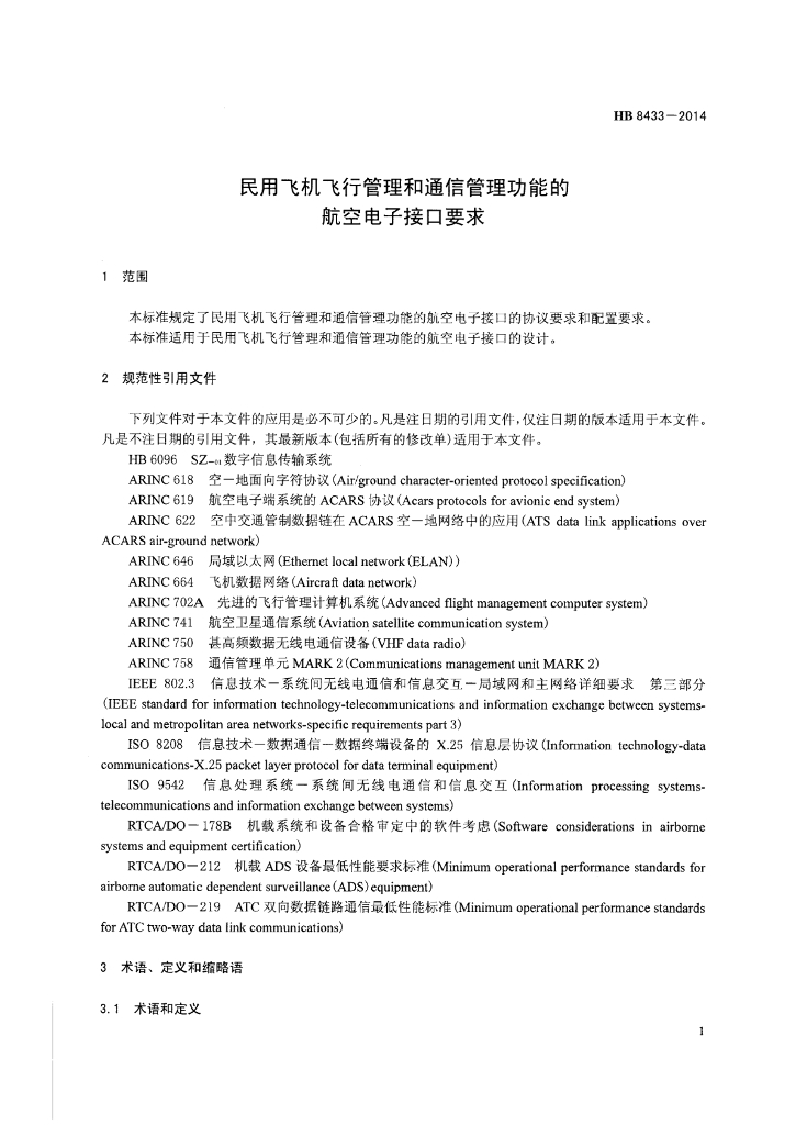 HB 8433-2014 民用飞机飞行管理和通信管理功能的航空电子接口要求