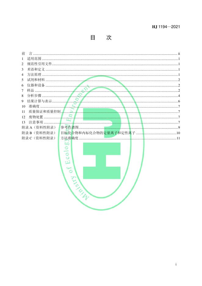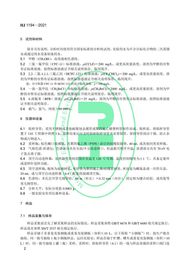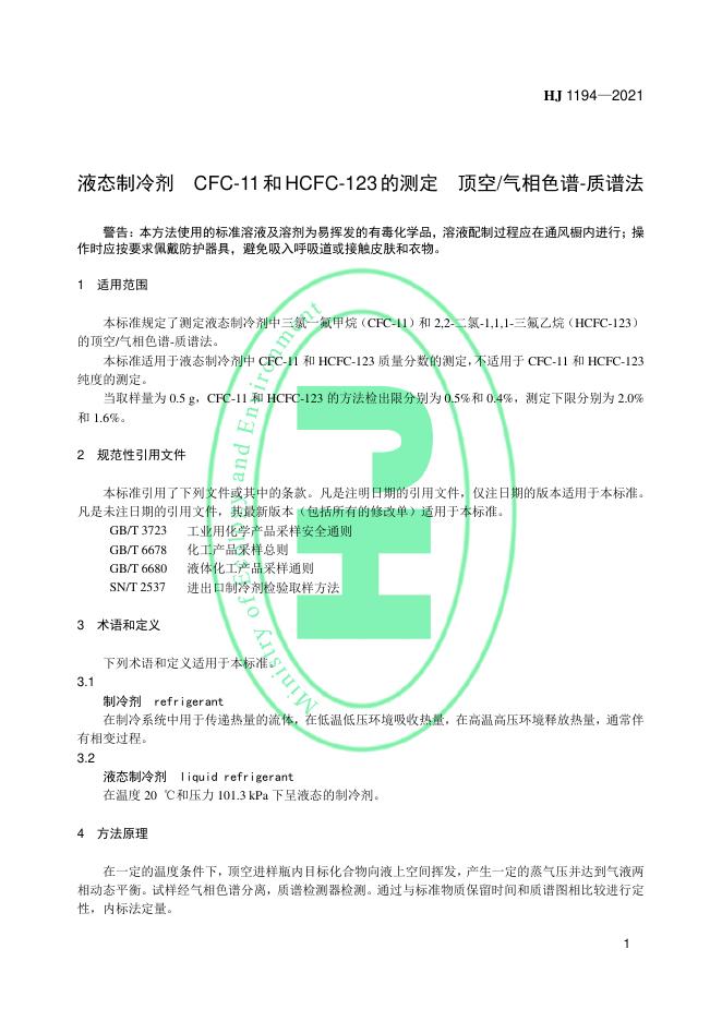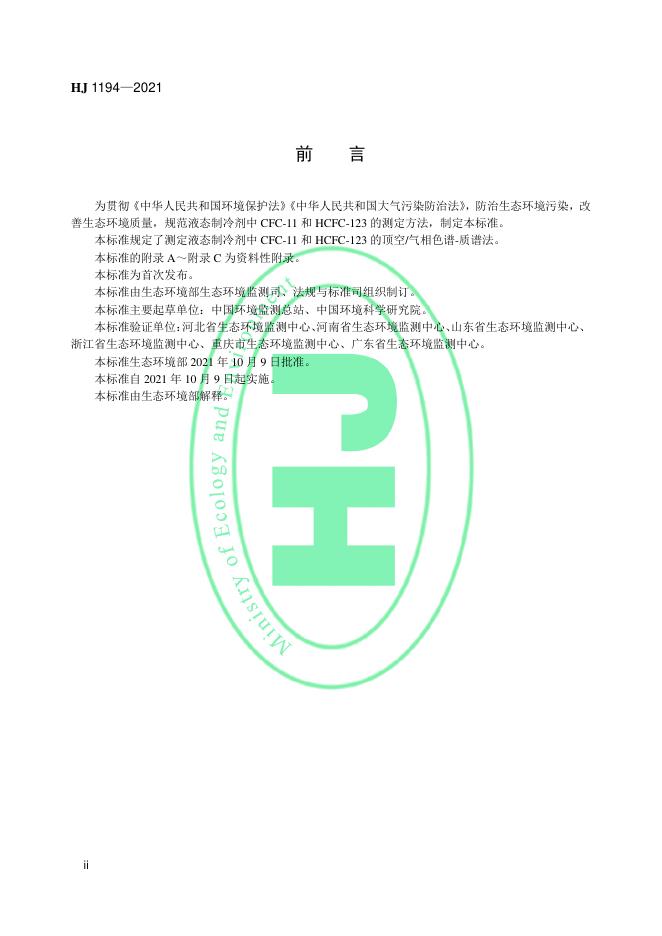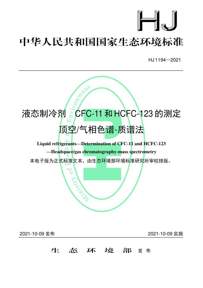HJ 1194-2021 液态制冷剂 CFC-11和HCFC-123的测定 顶空/气相色谱-质谱法