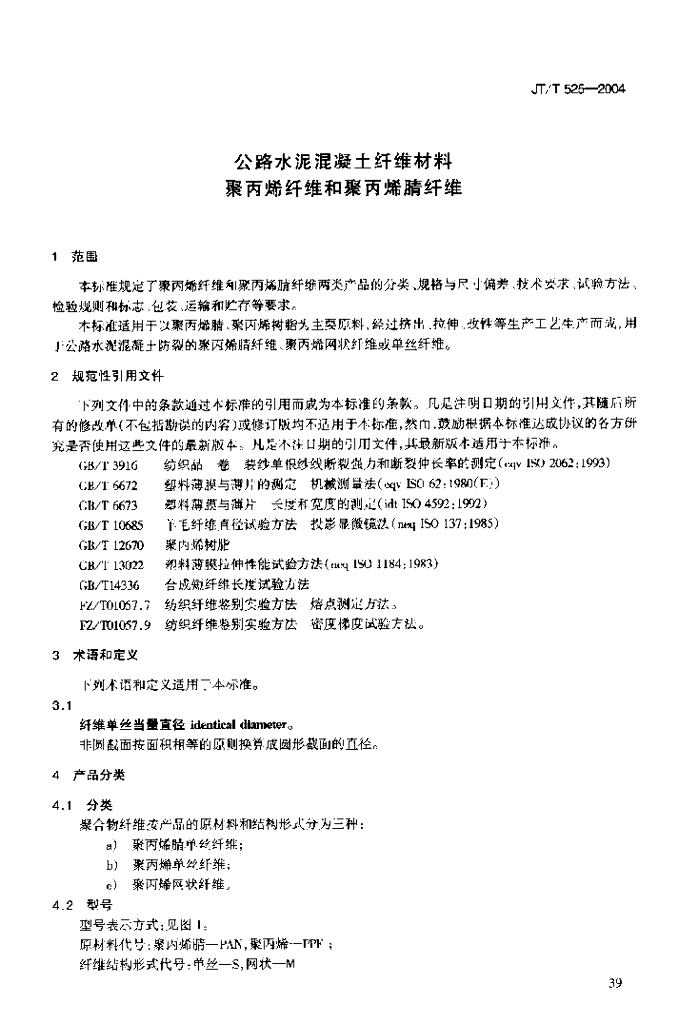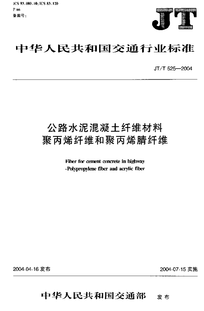 JT/T 525-2004 公路水泥混凝土纤维材料聚丙烯纤维和聚丙烯腈纤维