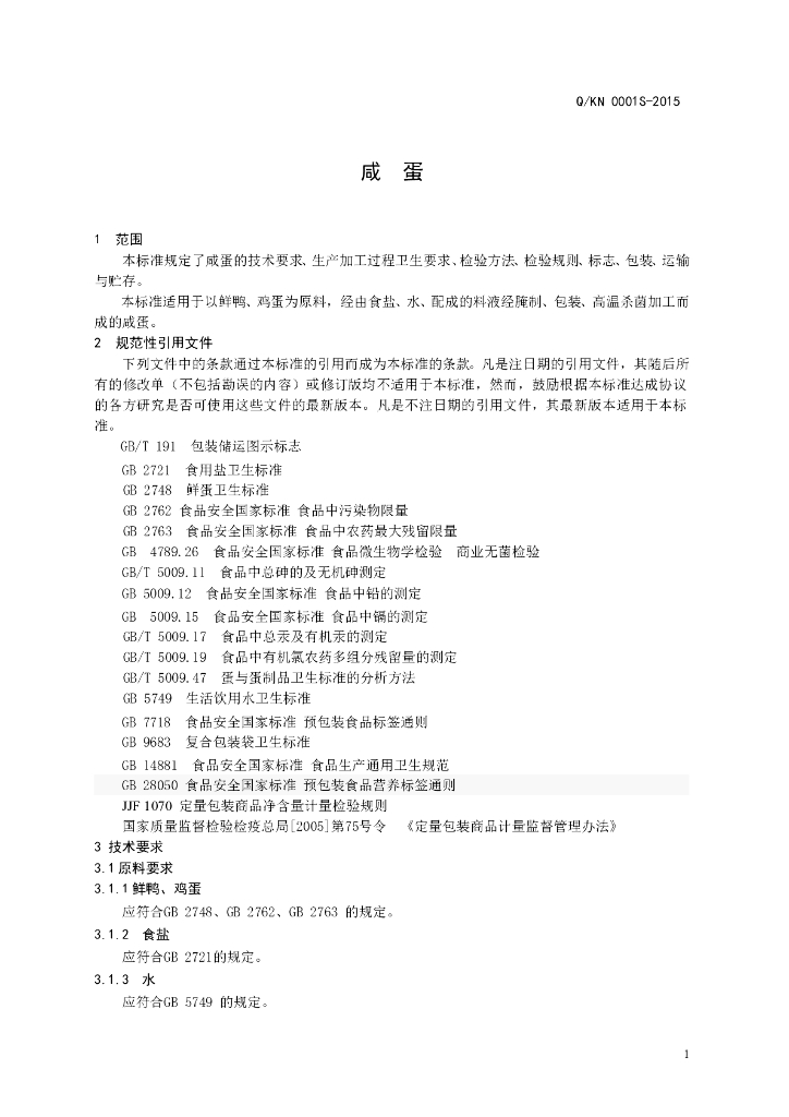 Q/KN 0001S-2015 济南凯诺食品有限公司 咸蛋