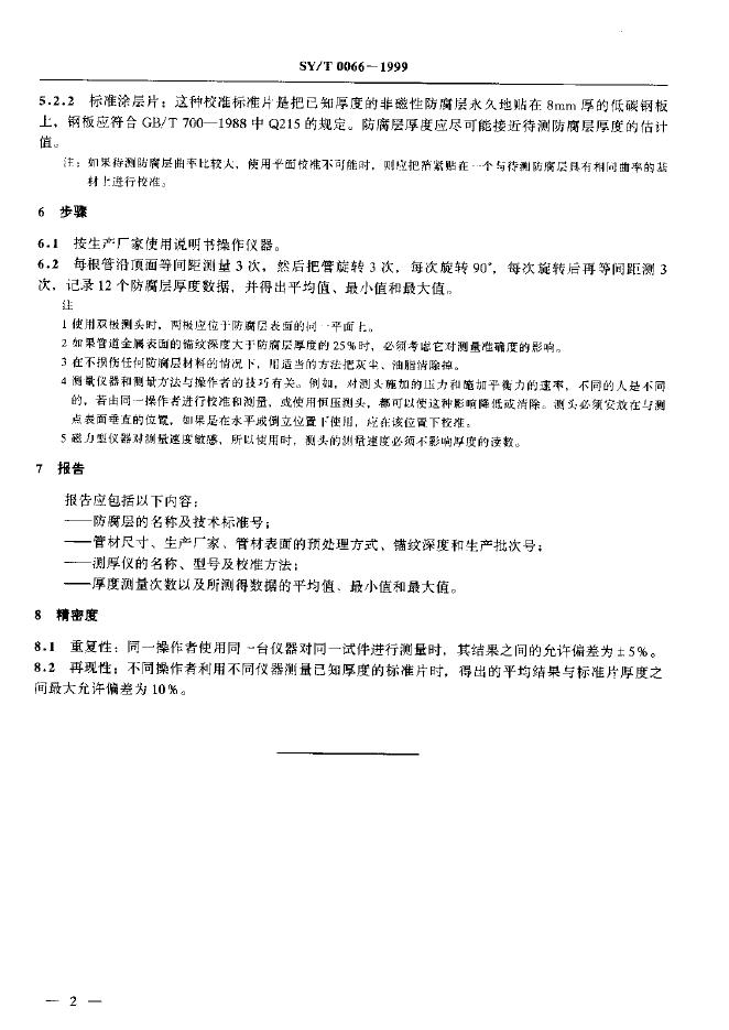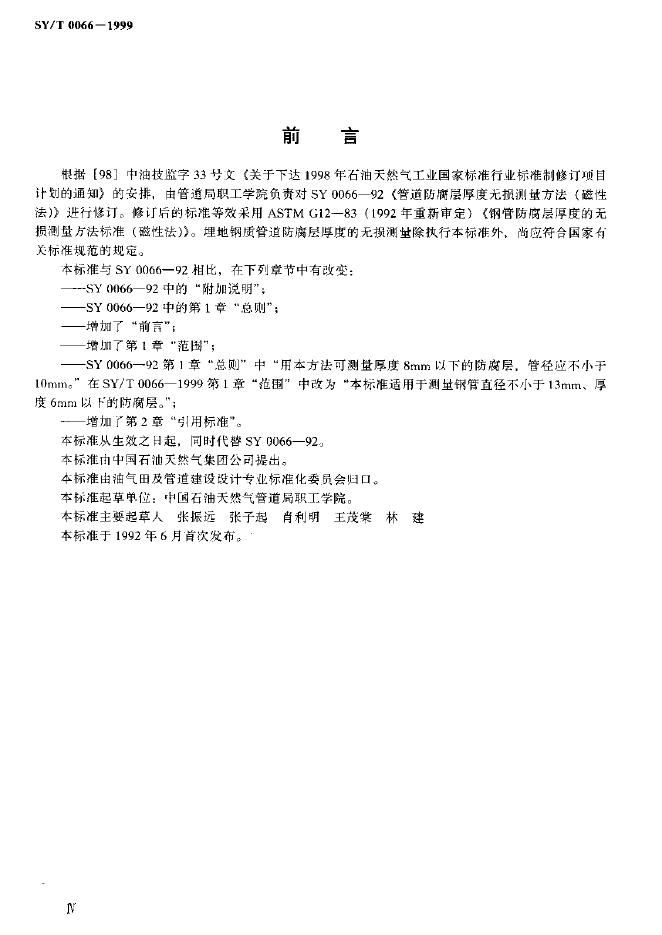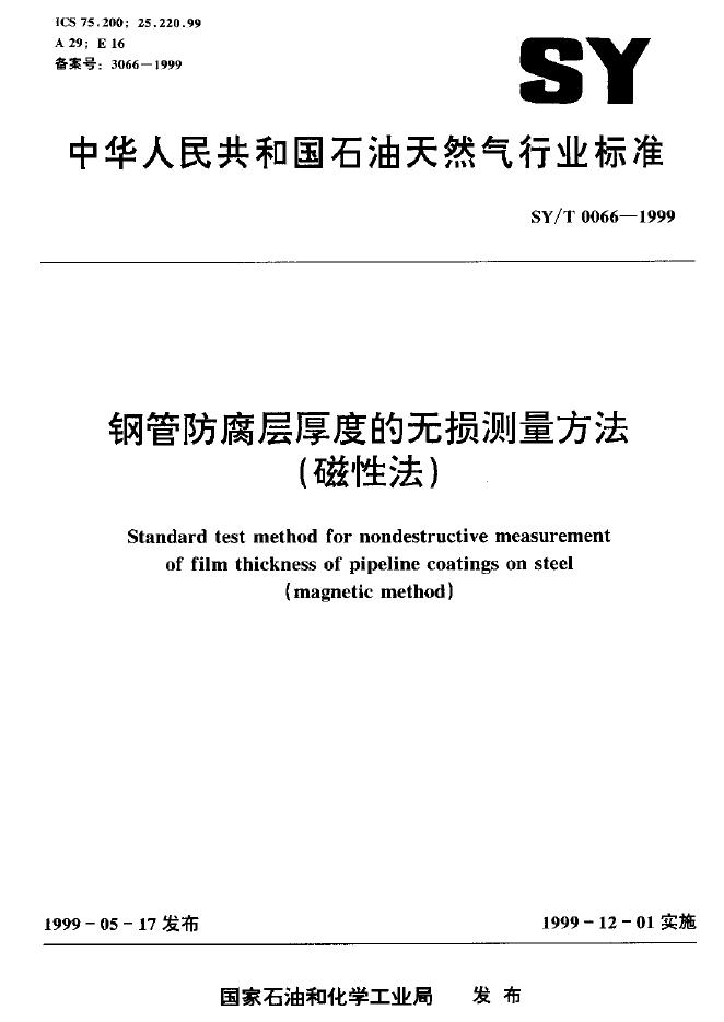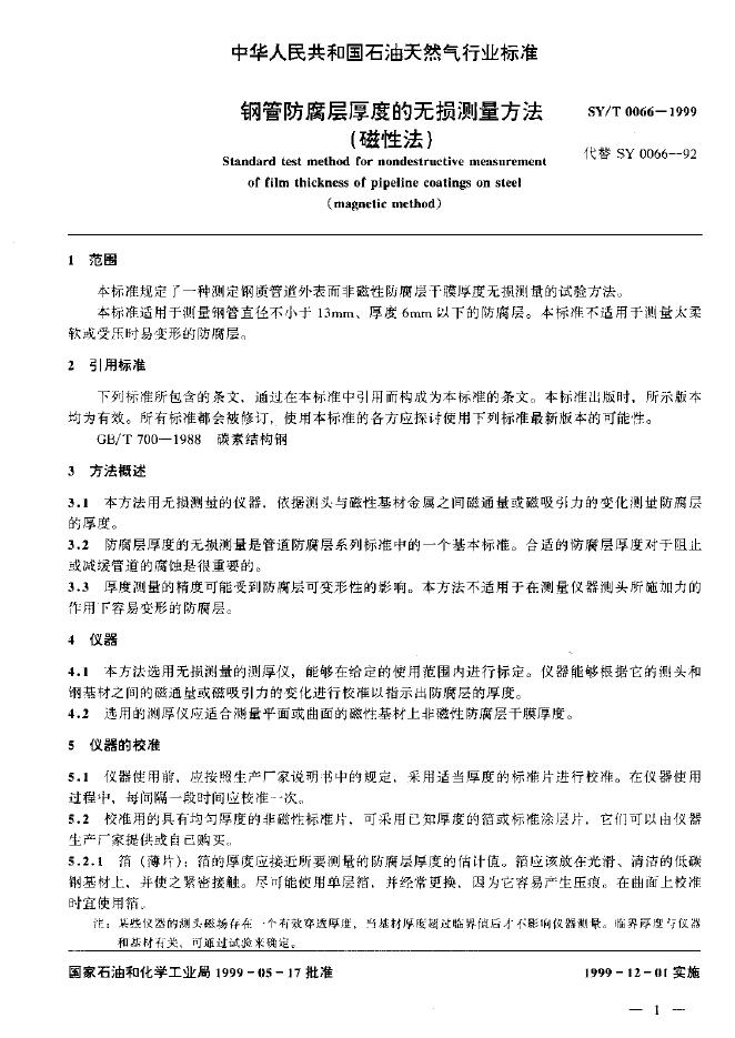 SY 0066-1992 管道防腐层厚度的无损测量方法磁性法