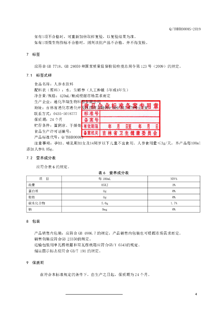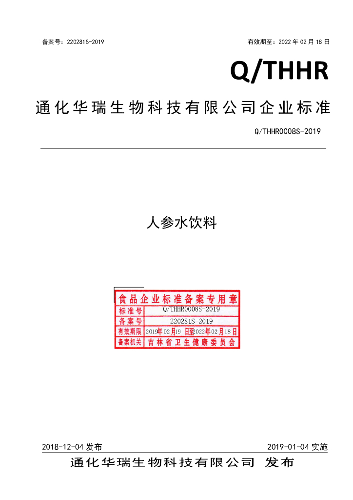 Q/THHR 0008S-2019 人参水饮料