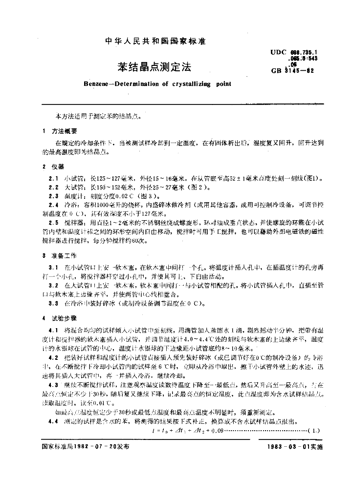 GB/T 3145-1982 苯结晶点测定法