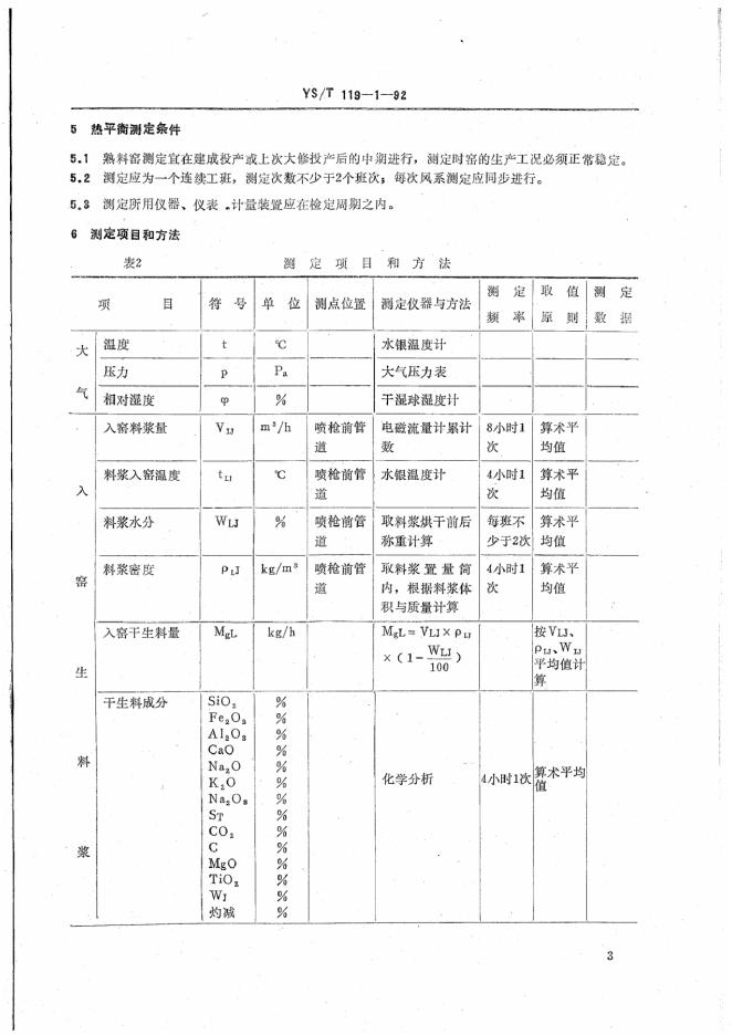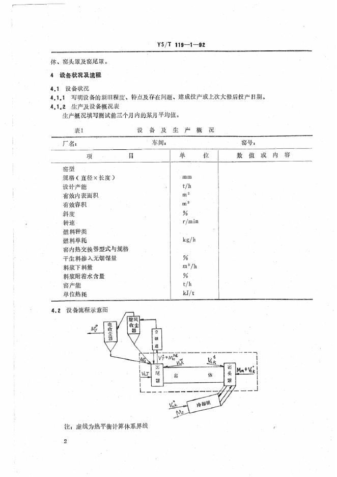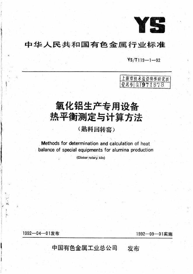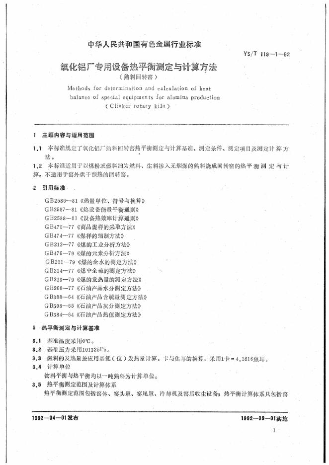 YS 119-1992 氧化铝生产专用设备热平衡测定与计算方法