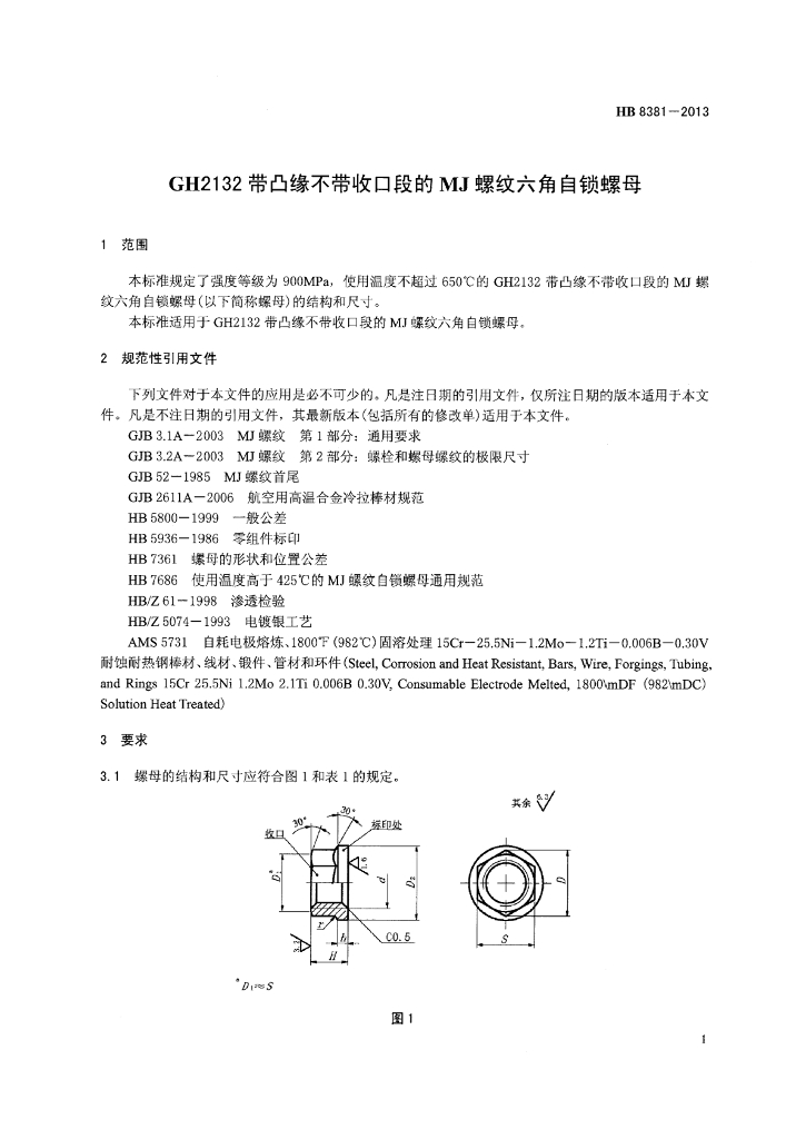 HB 8381-2013 GH2132带凸缘不带收口段的MJ螺纹六角自锁螺母