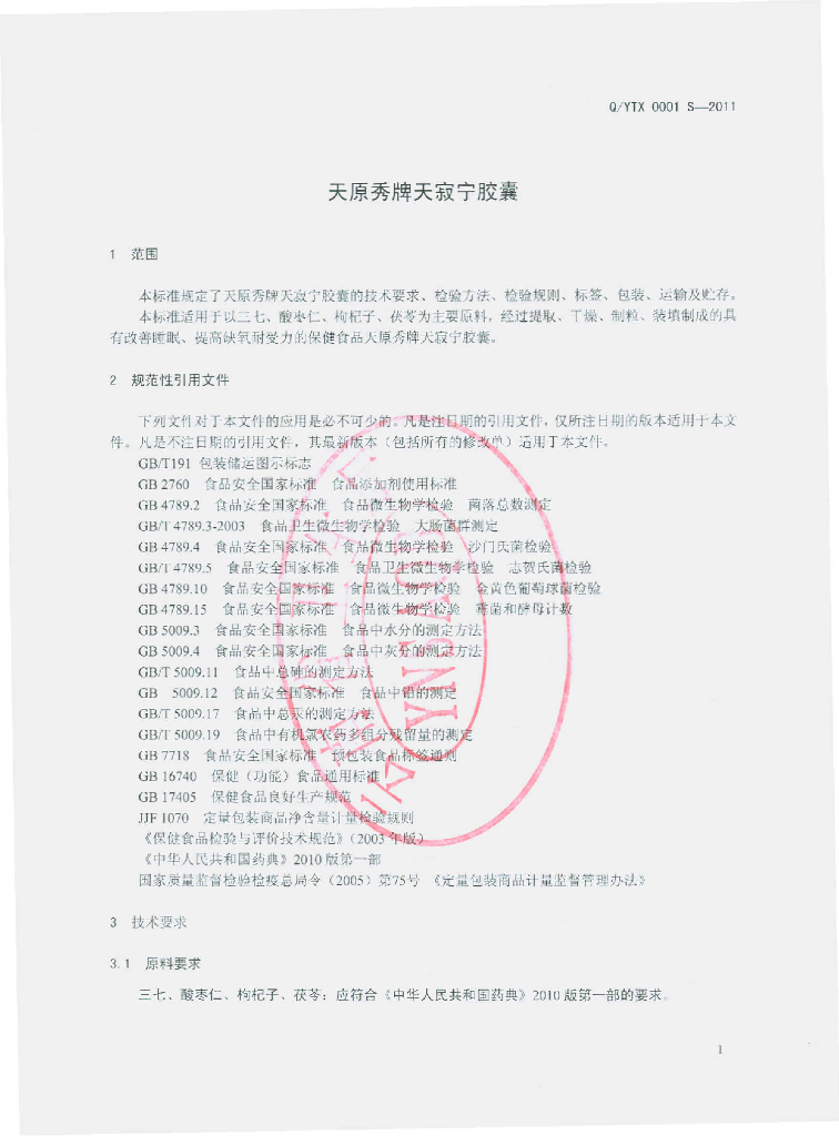 Q/YTX 0001S-2011 天远秀牌天寂宁胶囊
