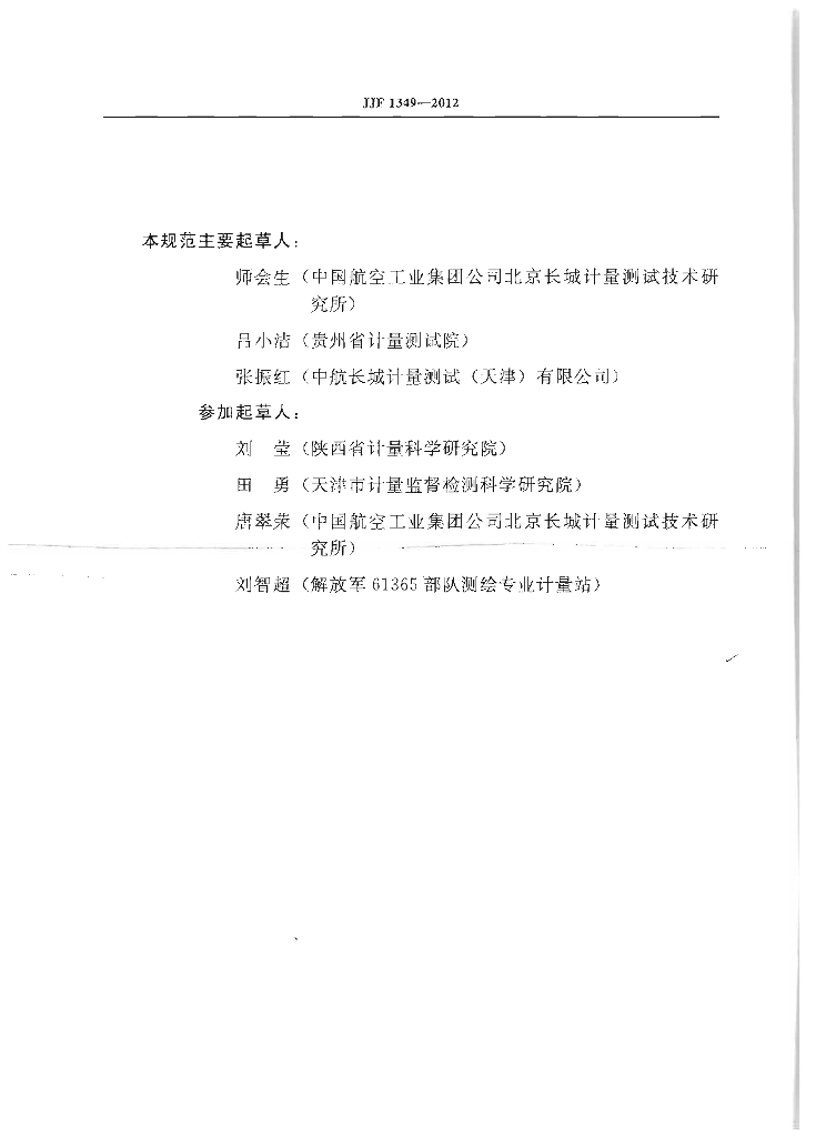 师会生(中国航空工业集团公司北京长城计量测试技术研究所)、吕小洁(贵州省计量测试院)、张振红(中航长城计量测试(天津)有限公司)、刘莹(陕西省计量科学研究院)、田勇(天津市计量监督检测科学研究院)、唐翠荣(中国航空工业集团公司北京长城计量测试技术研究所)、刘智超(解放军61365部队测绘专业计量站)