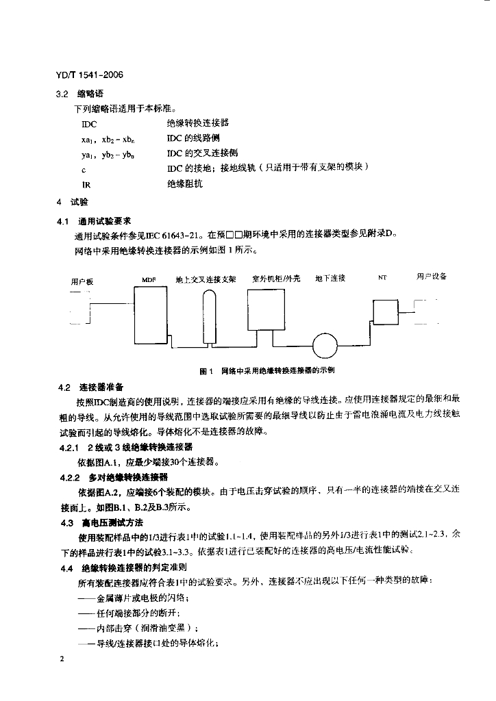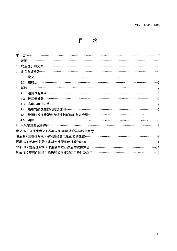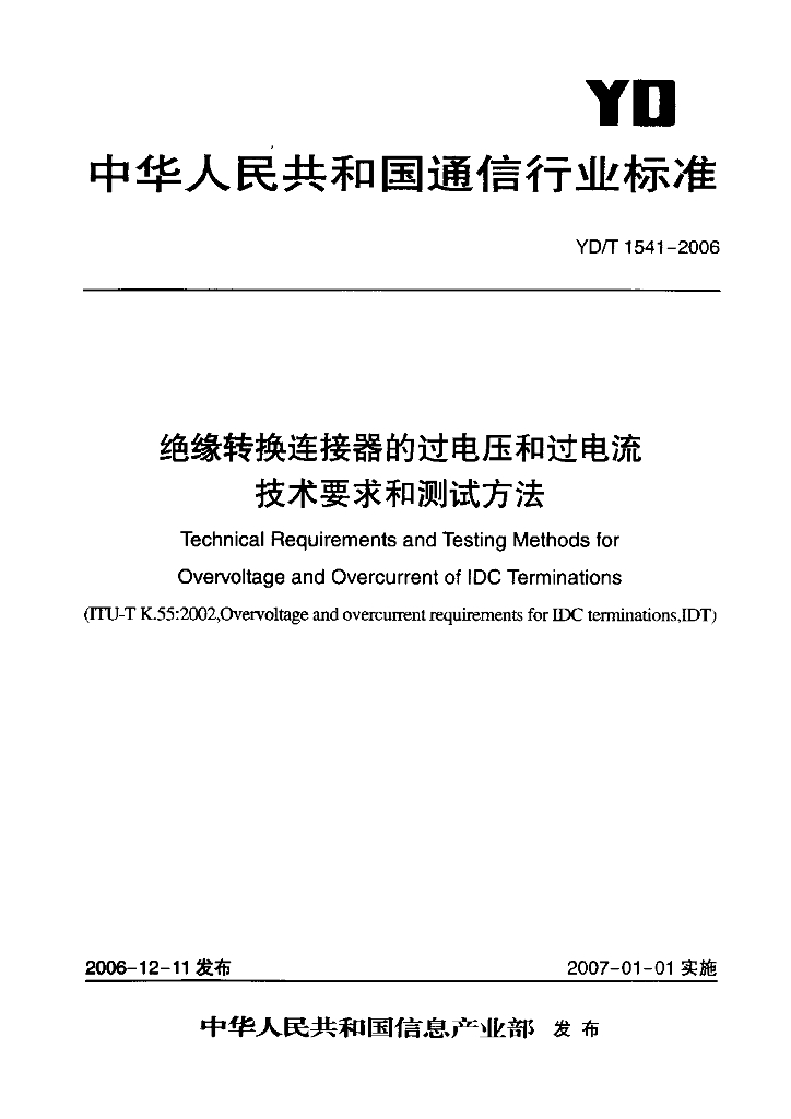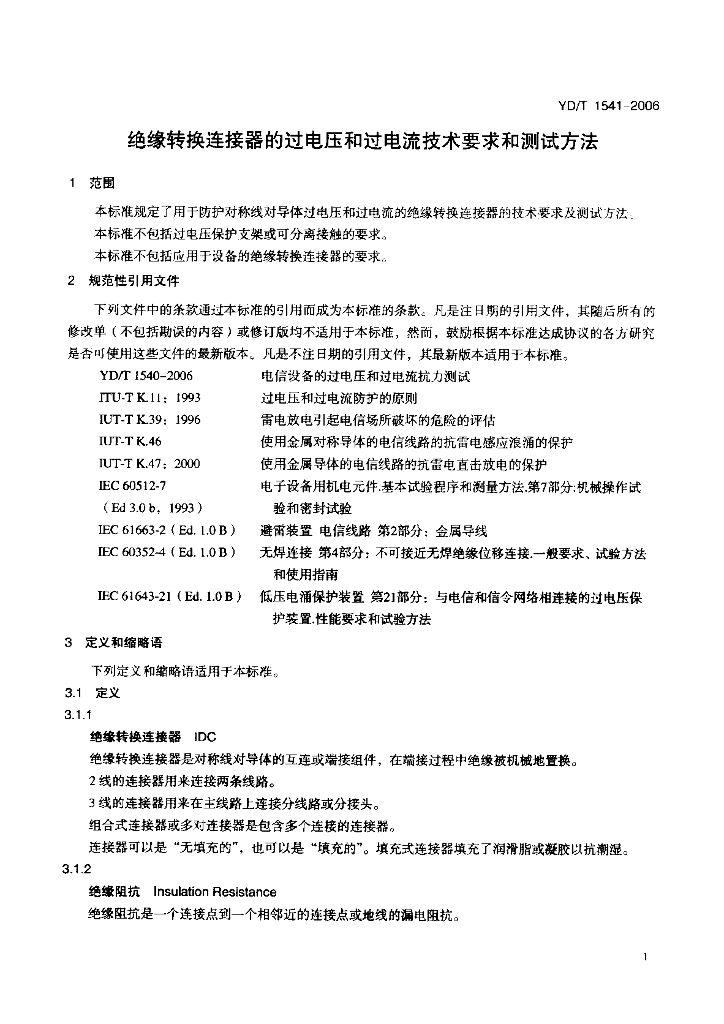 YD/T 1541-2006 绝缘转换连接器的过电压和过电流技术要求和测试方法