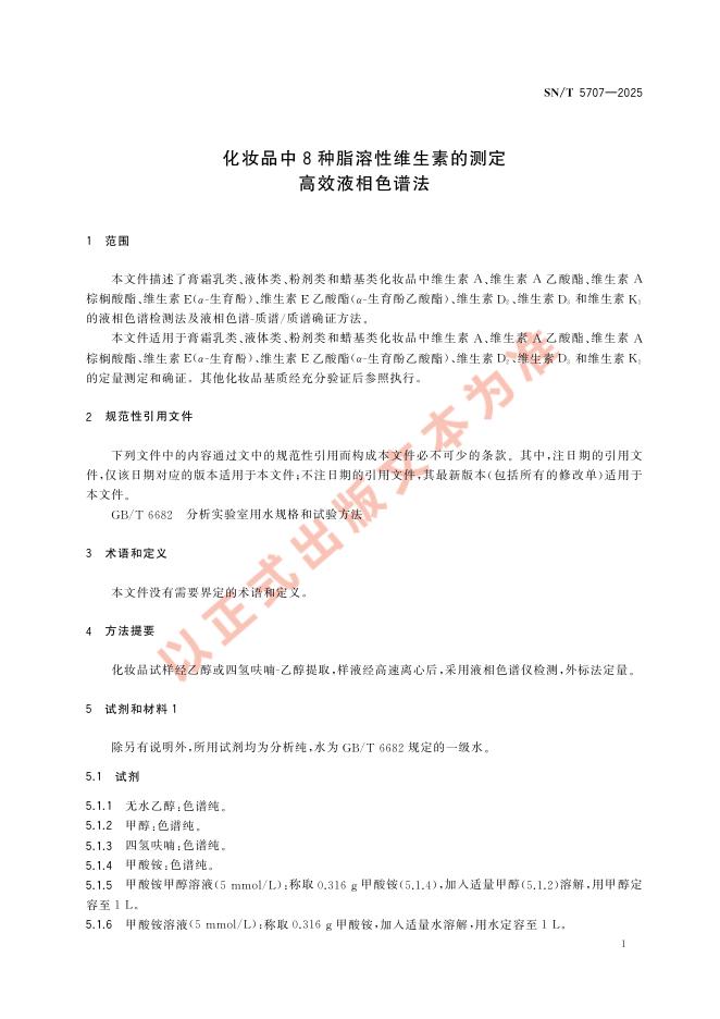 SN/T 5707-2025 化妆品中8种脂溶性维生素的测定 高效液相色谱法