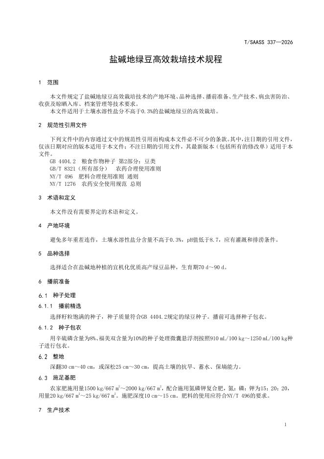 T/SAASS 337-2026 盐碱地绿豆高效栽培技术规程