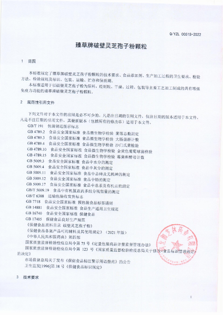 Q/YZL 0051S-2022 臻草牌破壁灵芝孢子粉颗粒
