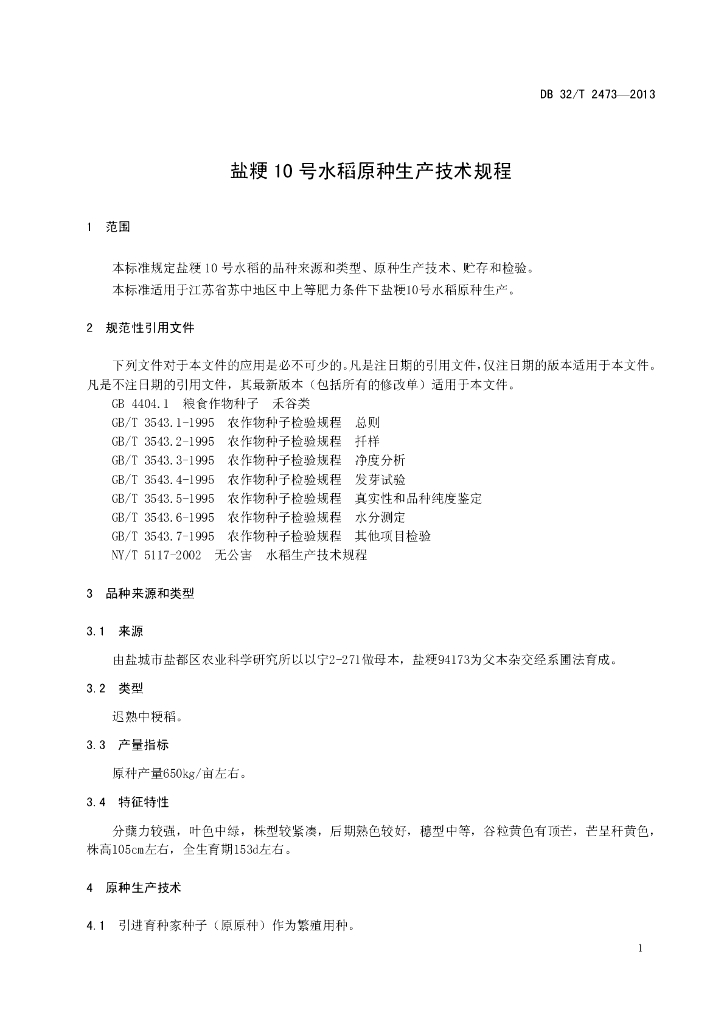 DB32/T 2473-2013 盐粳10 号水稻原种生产技术规程