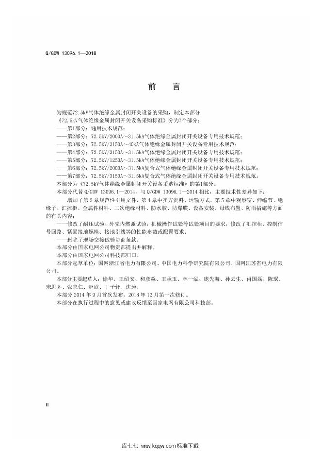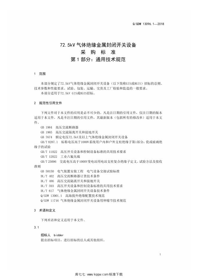 Q/GDW 13096.1-2018 72.5kV气体绝缘金属封闭开关设备采购标准 第1部分:通用技术规范