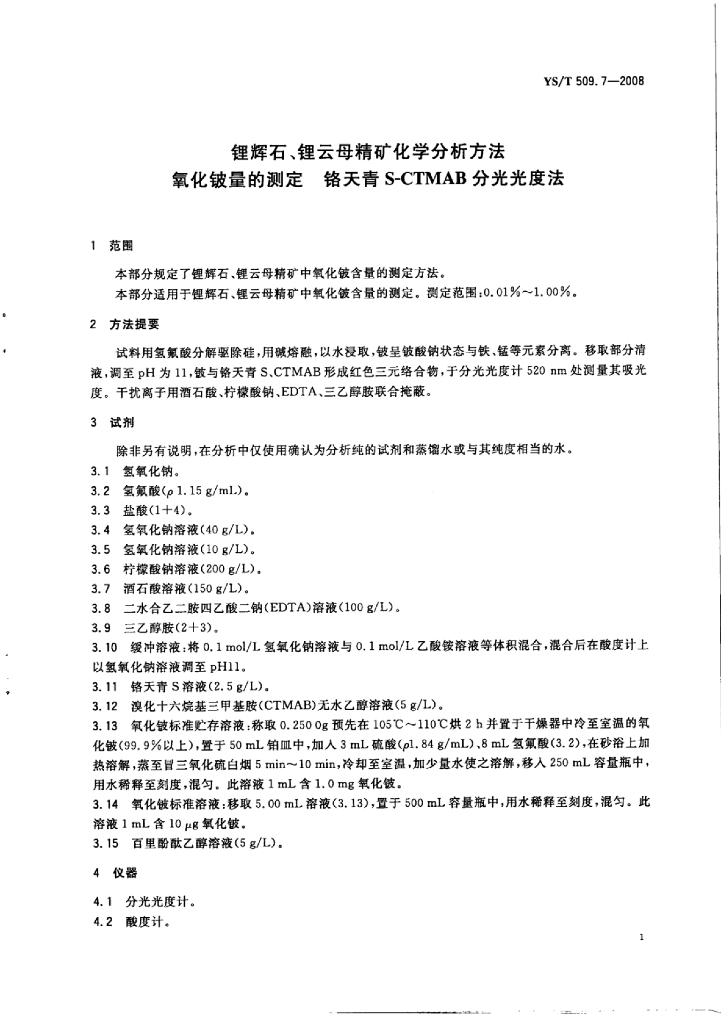 YS/T 509.7-2008 锂辉石、锂云母精矿化学分析方法氧化铍量的测定铬天青S-CTMAB分光光度法
