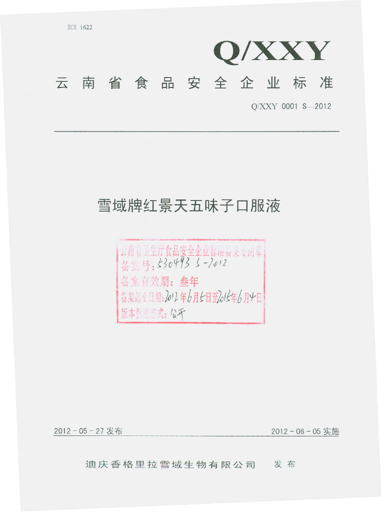 Q/XXY 0001S-2012 雪域牌红景天五味子口服液