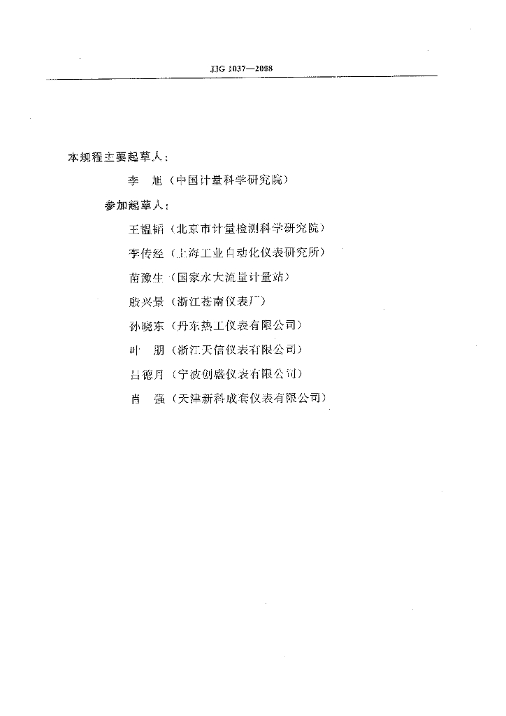 李旭(中国计量科学研究院)、王韫韬(北京市计量检测科学研究院)、李传经(上海工业自动化仪表研究所)、苗豫生(国家水大流量计量站)、殷兴景(浙江苍南仪表厂)、孙晓东(丹东热工仪表有限公司)、叶朋(浙江天信仪表有限公司)、吕德月(宁波创盛仪表有限公司)、肖强(天津新科成套仪表有限公司)
