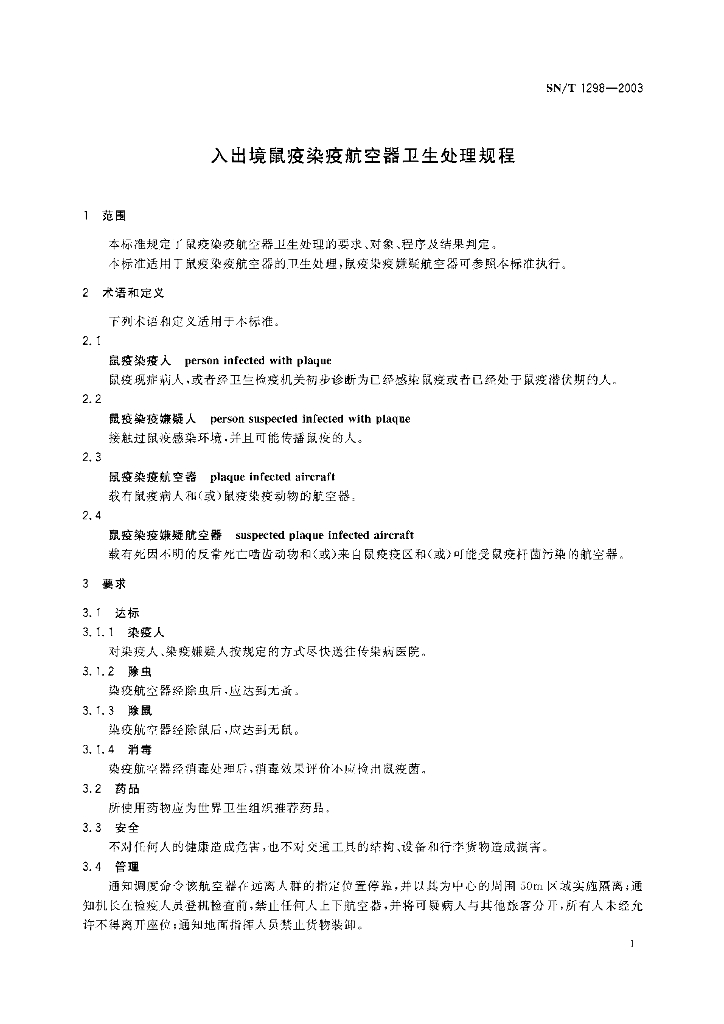 SN/T 1298-2003 入出境鼠疫染疫航空器卫生处理规程