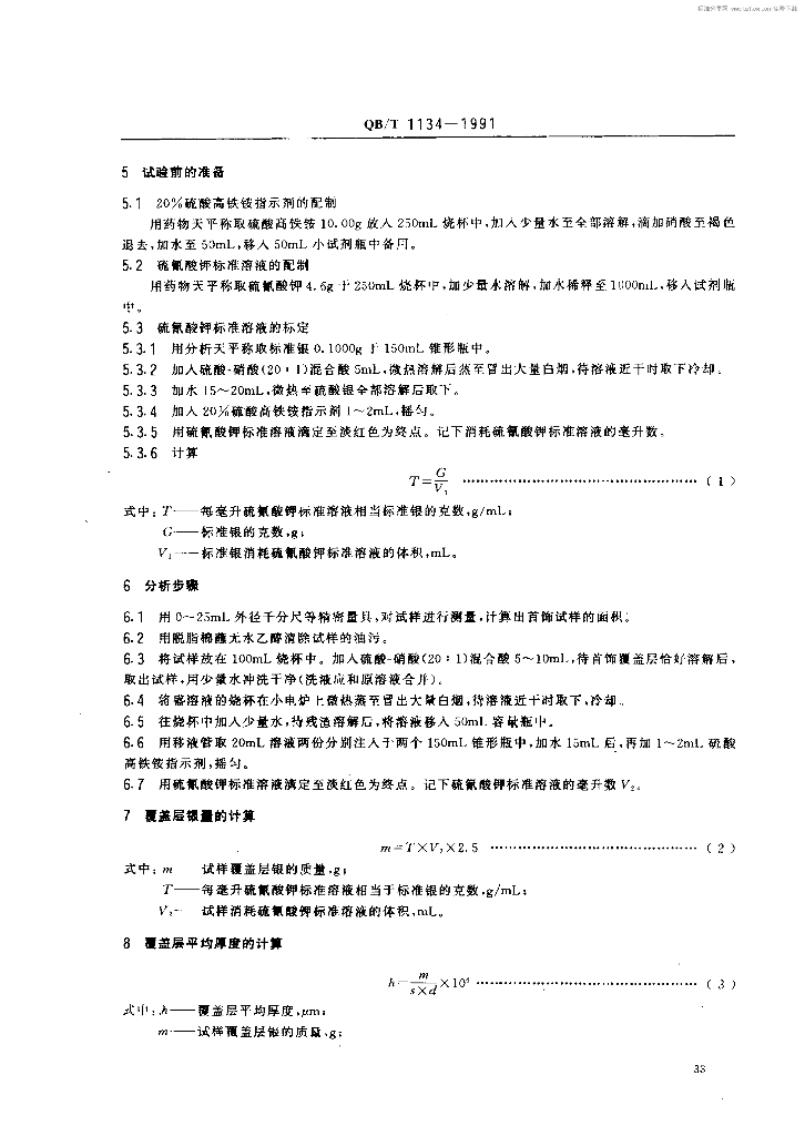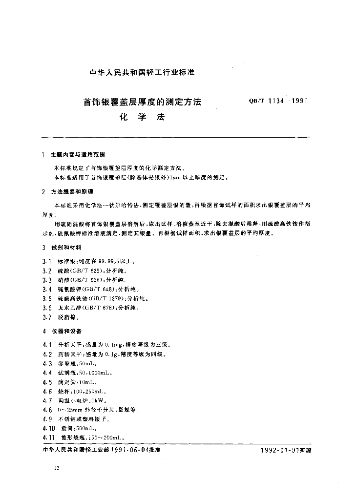 QB/T 1134-1991 首饰银覆盖层厚度的测定方法化学法