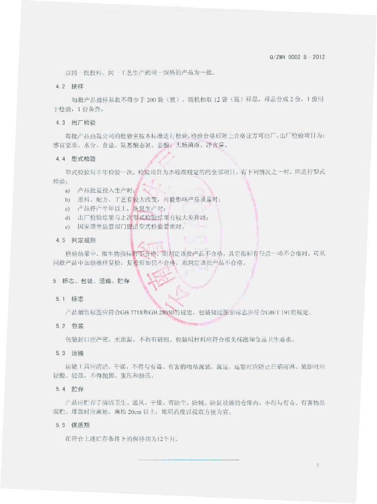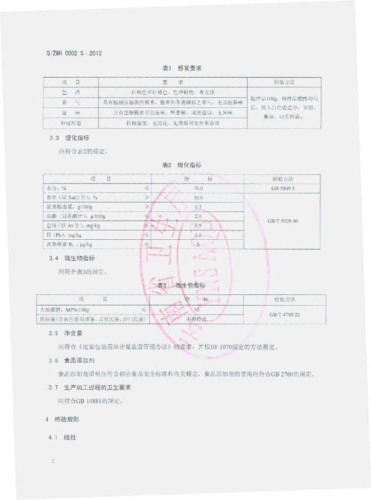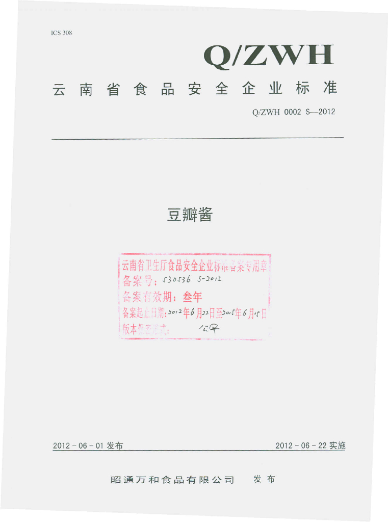 Q/ZWH 0002S-2012 豆瓣酱