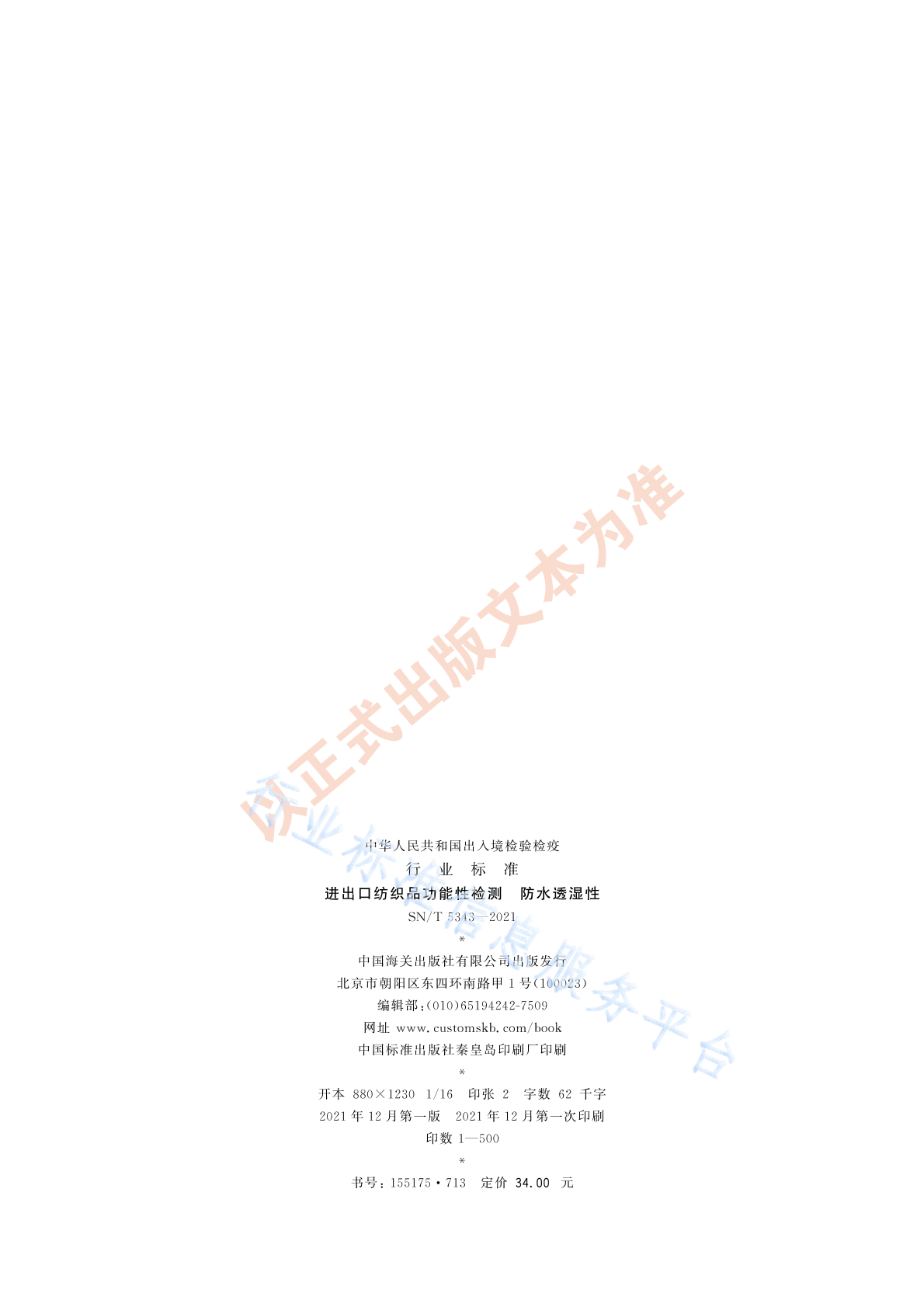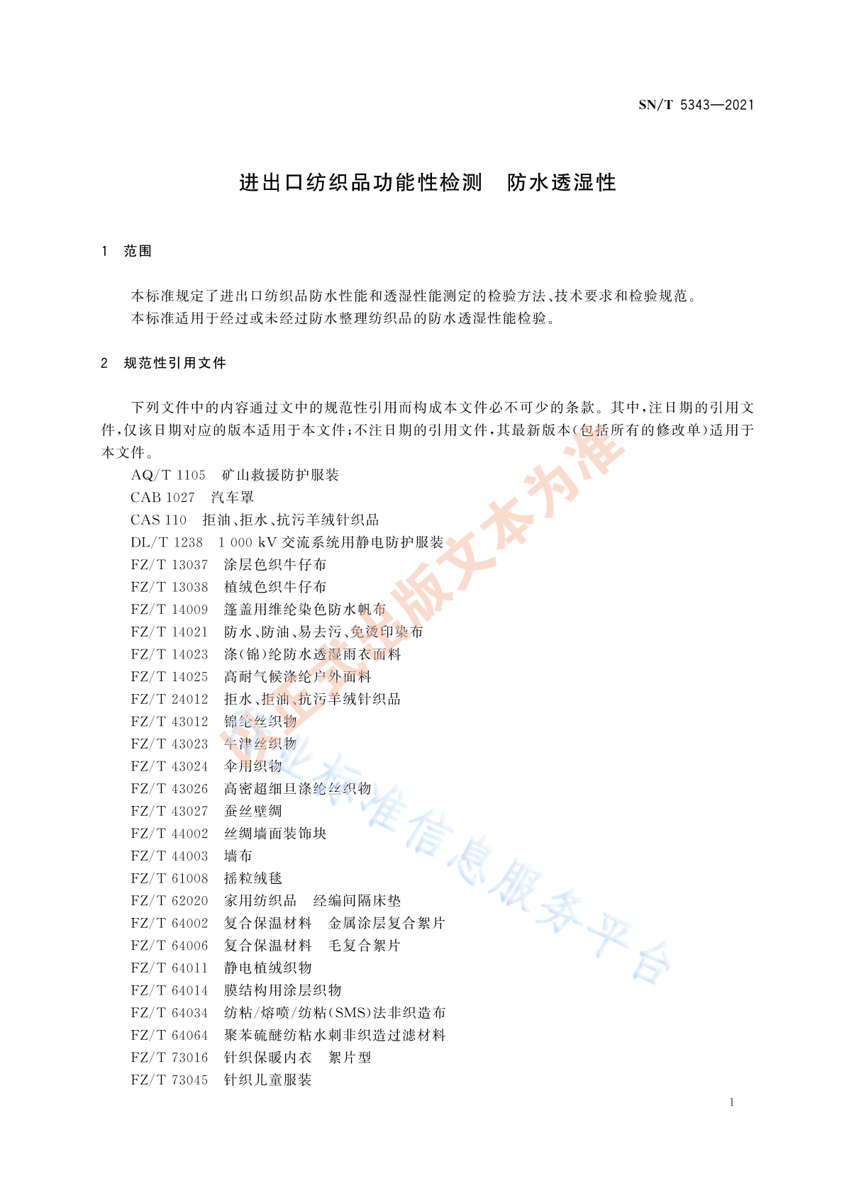 SN/T 5343-2021 进出口纺织品功能性检测 防水透湿性