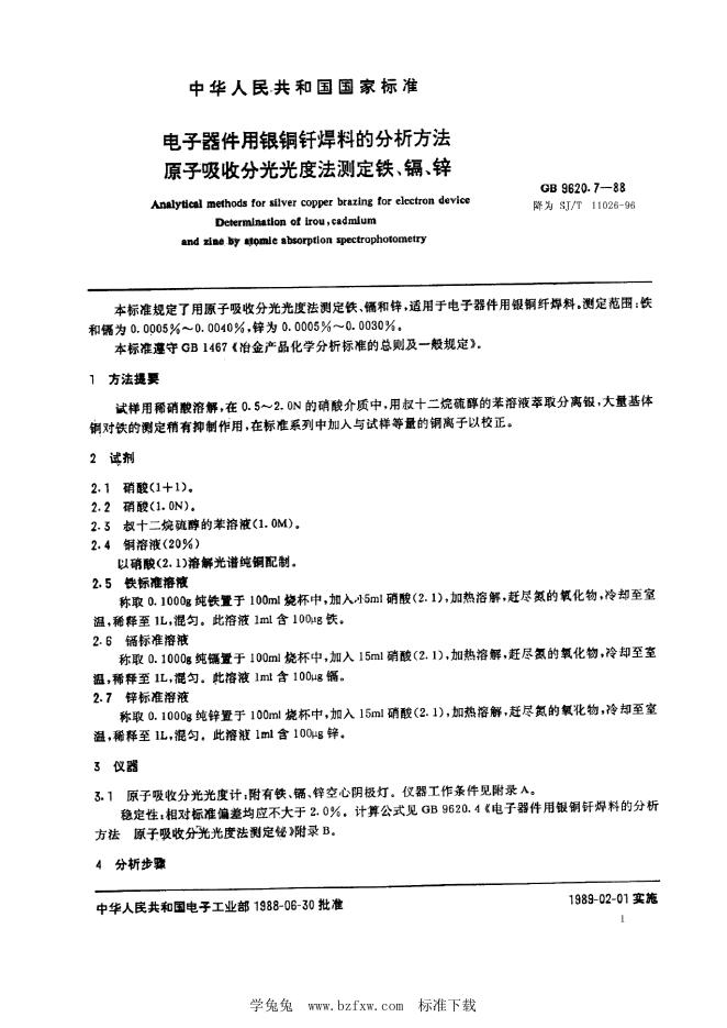 SJ/T 11026-1996 电子器件用银铜钎焊料的分析方法 原子吸收分光光度法测定铁、镉、锌