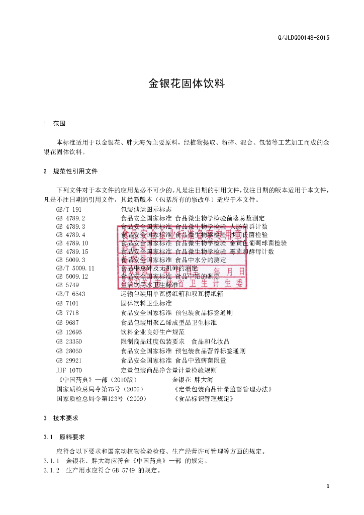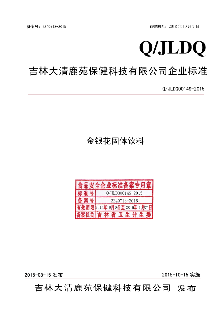 Q/JLDQ 0014S-2015 吉林大清鹿苑保健科技有限公司 金银花固体饮料