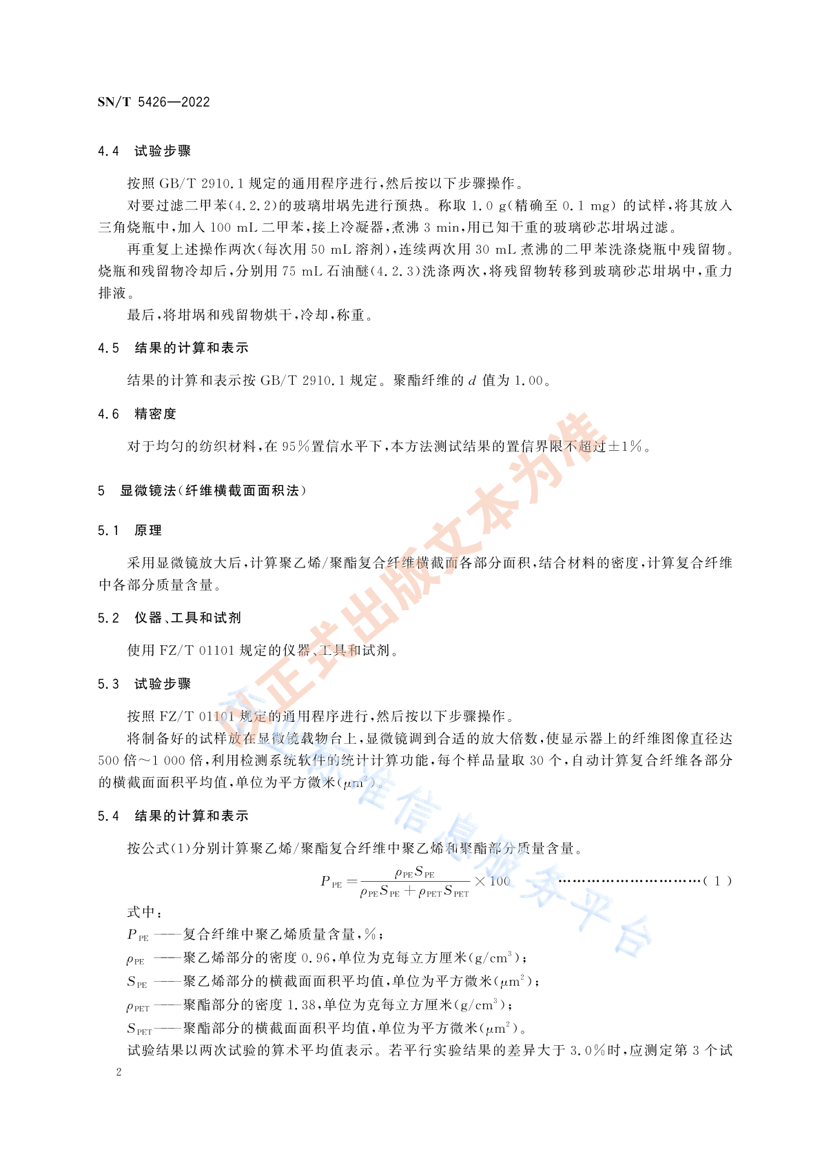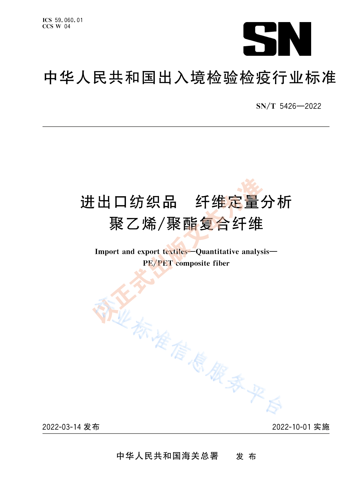 SN/T 5426-2022 进出口纺织品 纤维定量分析 聚乙烯/聚酯复合纤维
