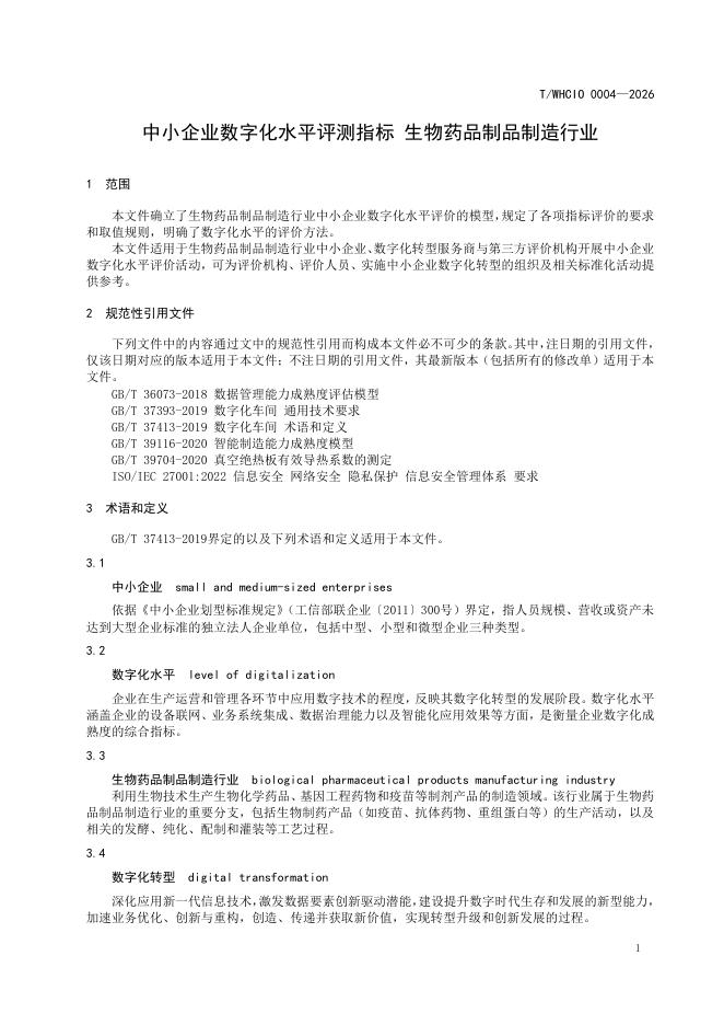 T/WHCIO 0004-2026 中小企业数字化水平评测规范 生物药品制品制造行业