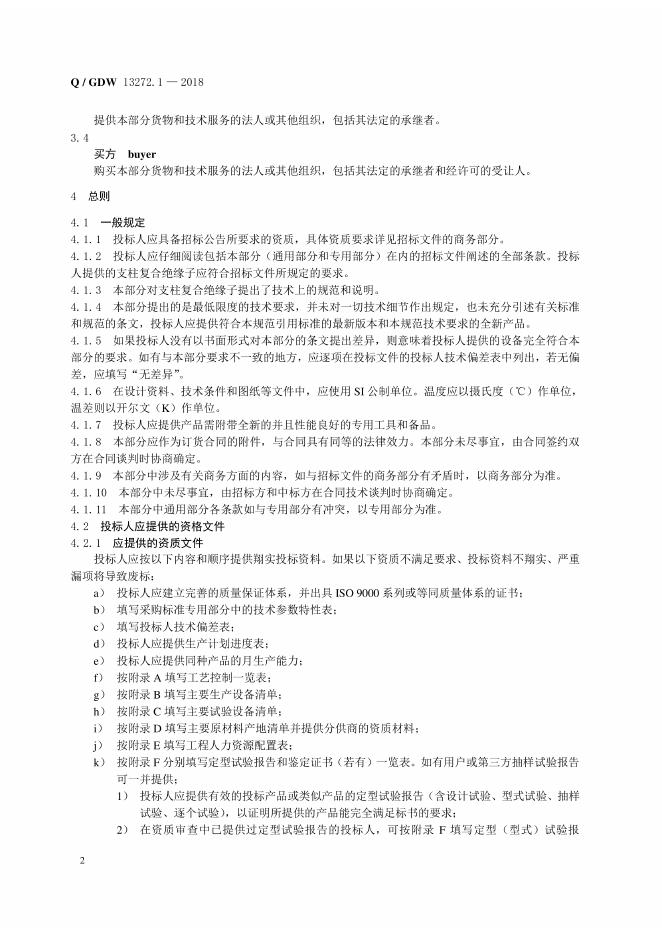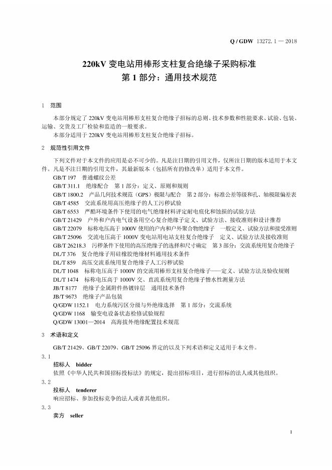 Q/GDW 13272.1-2018 220kV变电站用棒形支柱复合绝缘子采购标准 第1部分:通用技术规范