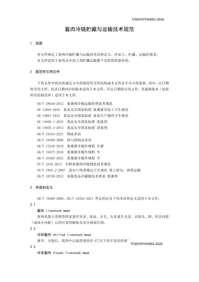 T/SXSYSYYXH 001-2026 畜肉冷链贮藏与运输技术规范