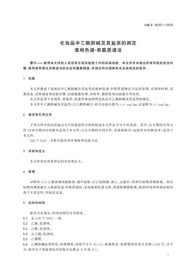 GB/T 46257-2025 化妆品中乙酰胆碱及其盐类的测定 液相色谱–串联质谱法