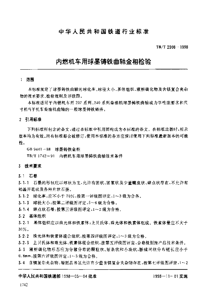 TB/T 2908-1998 内燃机车用球墨铸铁曲轴金相检验
