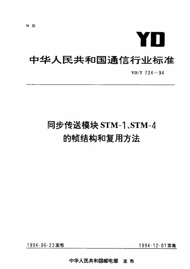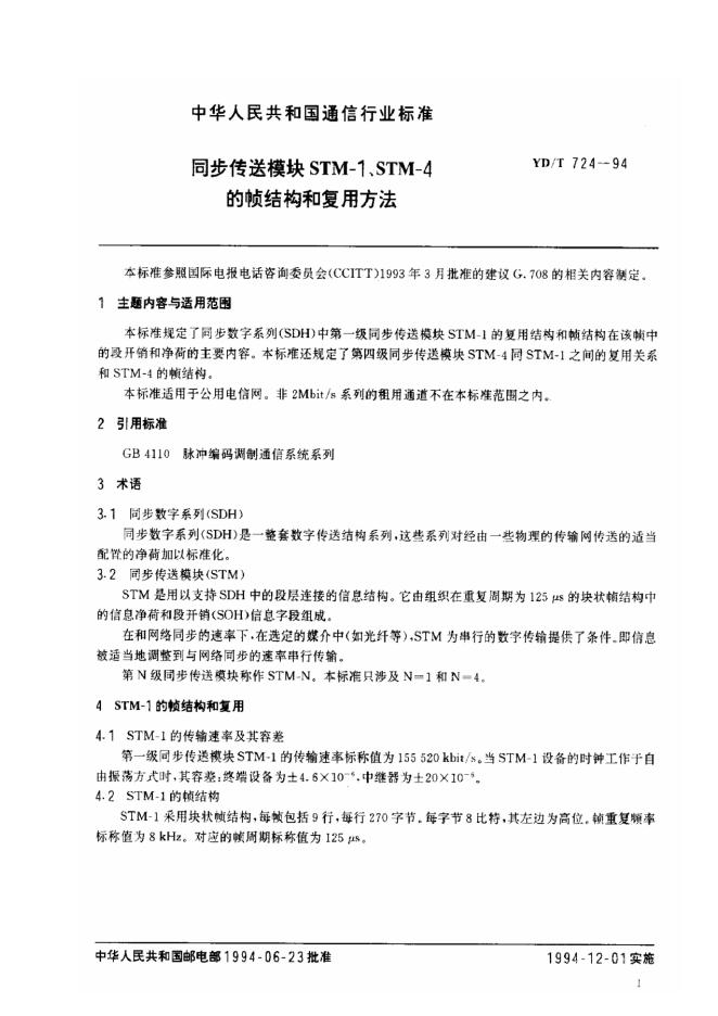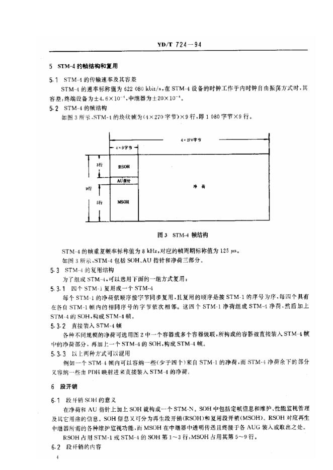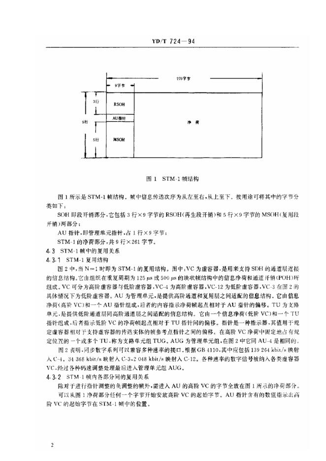 YD/T 724-1994 同步传送模块STM—1、STM-4的帧结构和复用方法