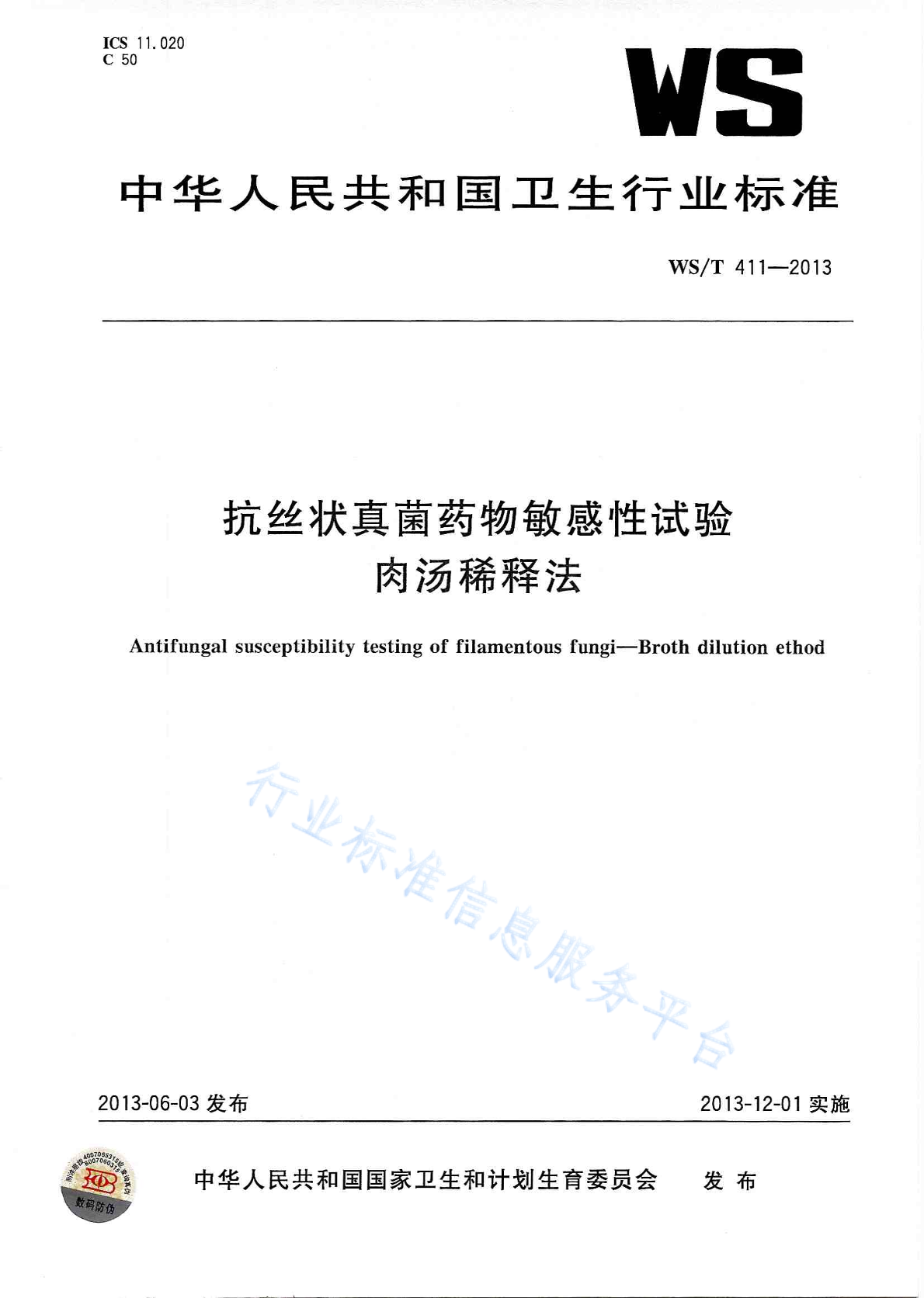 WS/T 411-2013 抗丝状真菌药物敏感性试验肉汤稀释法