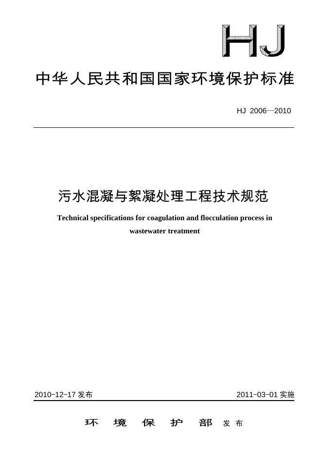 HJ 2006-2010 污水混凝与絮凝处理工程技术规范