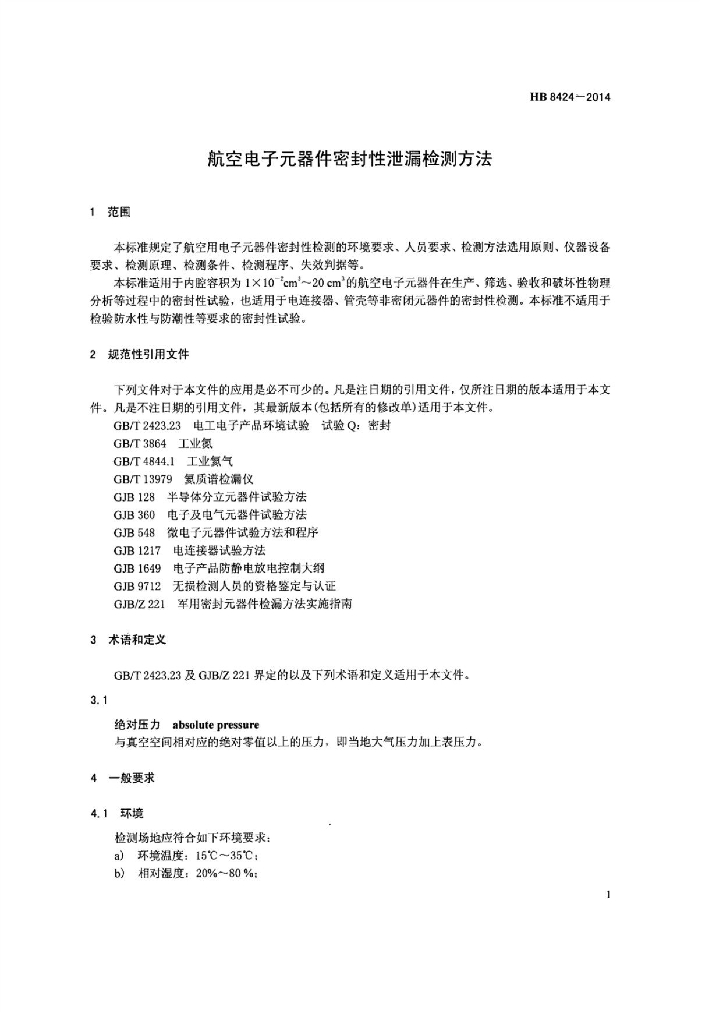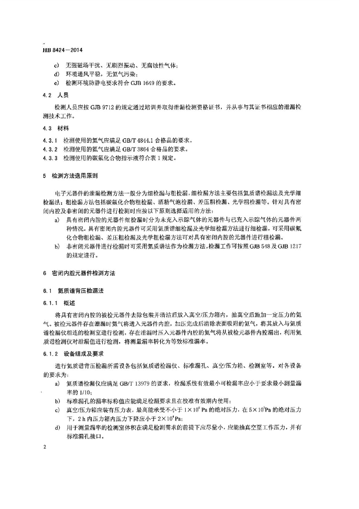 HB 8424-2014 航空电子元器件密封性泄漏检测方法