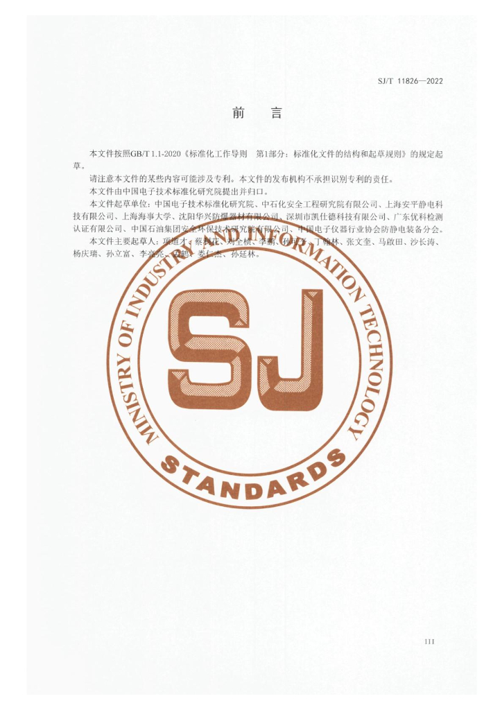 中国电子技术标准化研究院、中石化安全工程研究院有限公司、上海安平静电科技有限公司、上海海事大学、沈阳华兴防爆器材有限公司、深圳市凯仕德科技有限公司、广东优科检测认证有限公司、中国石油集团安全环保技术研究院有限公司、中国电子仪器行业协会防静电装备分会