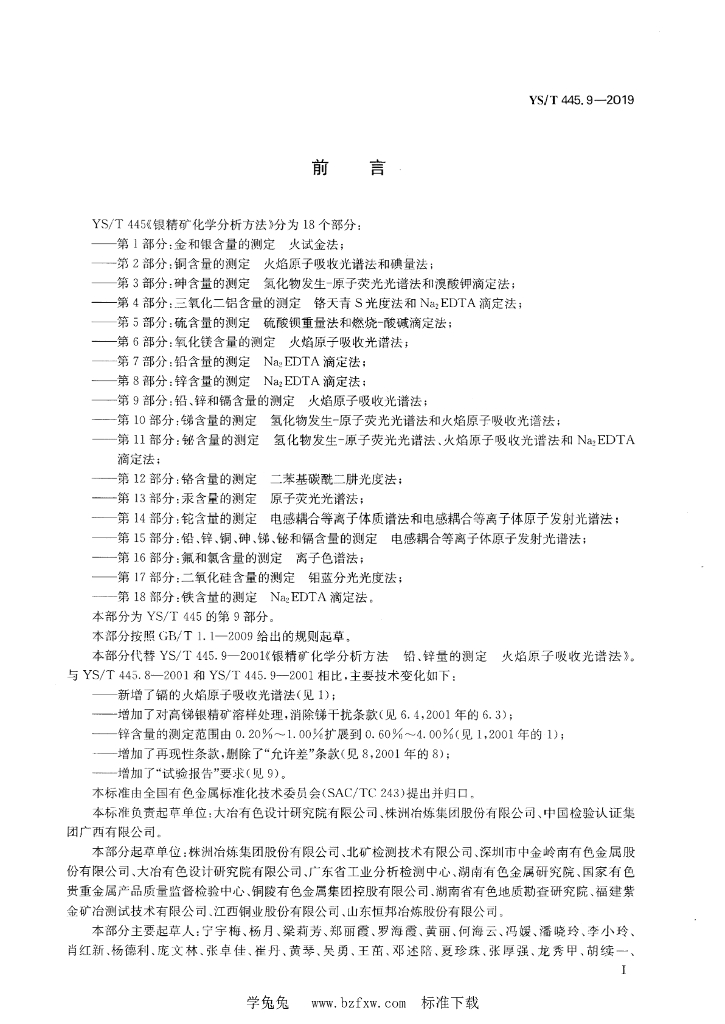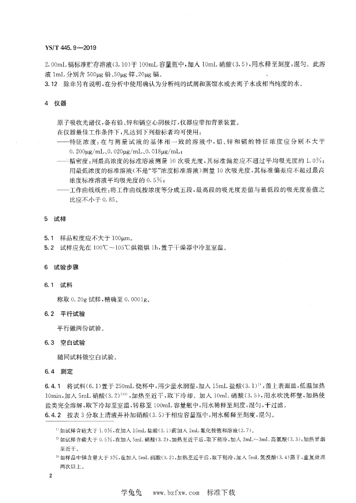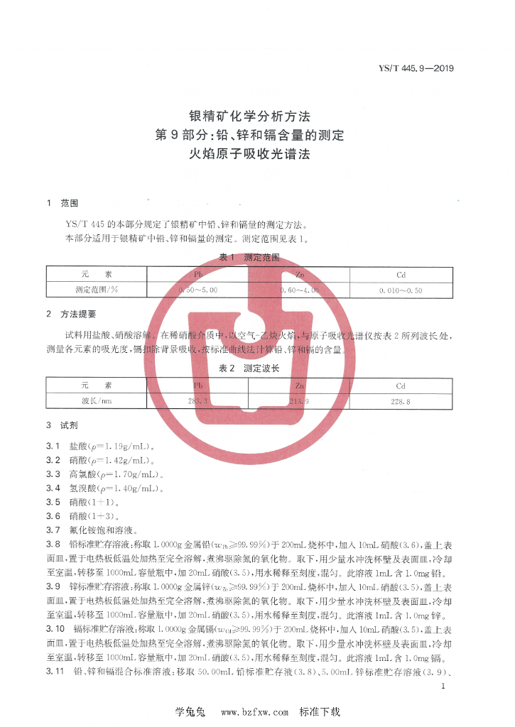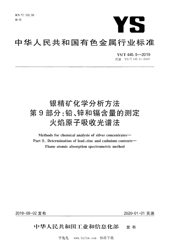 YS/T 445.9-2019 银精矿化学分析方法 第9部分:铅、锌和镉含量的测定 火焰原子吸收光谱法
