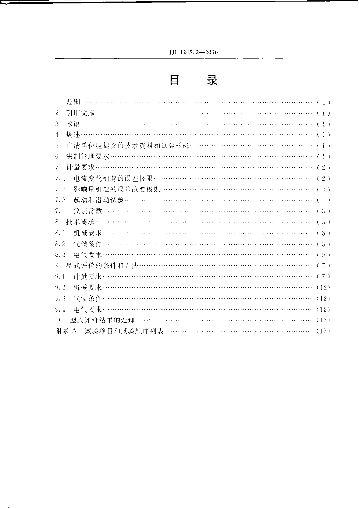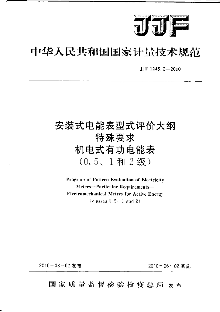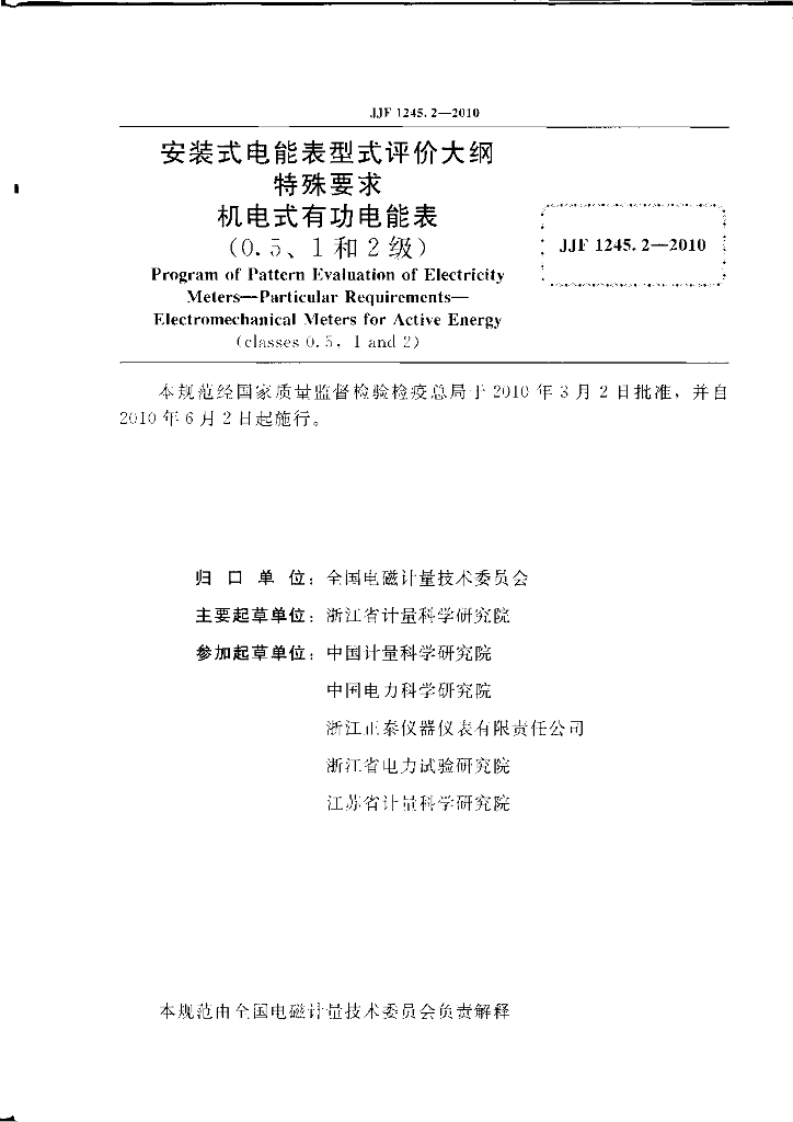 JJF 1245.2-2010 安装式电能表型式评价大纲 特殊要求 机电式有功电能表(0.5,1和2级)
