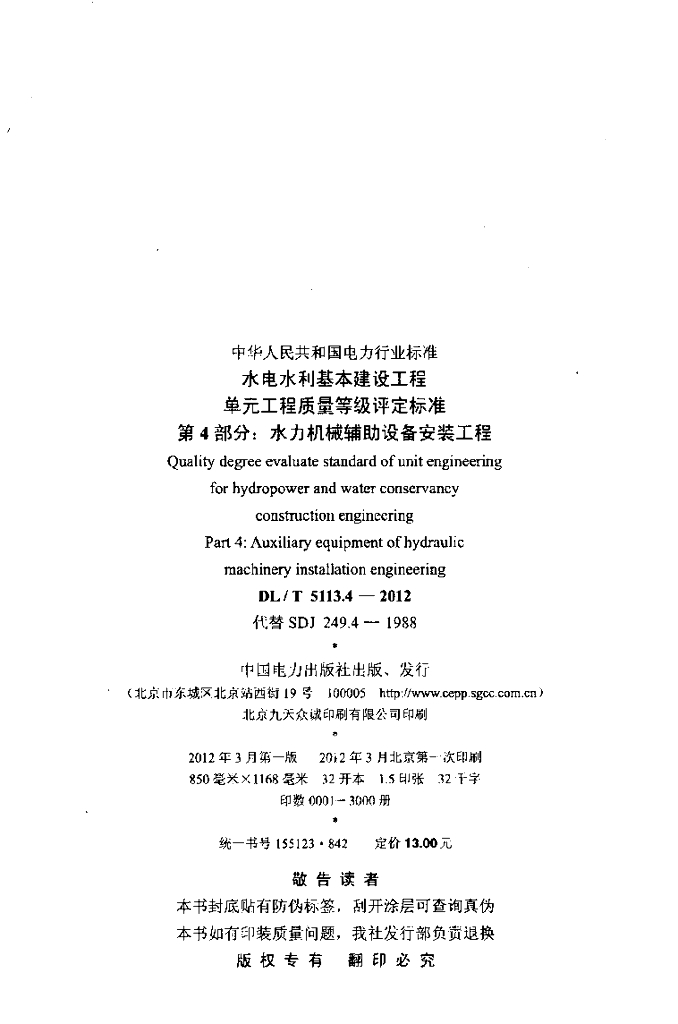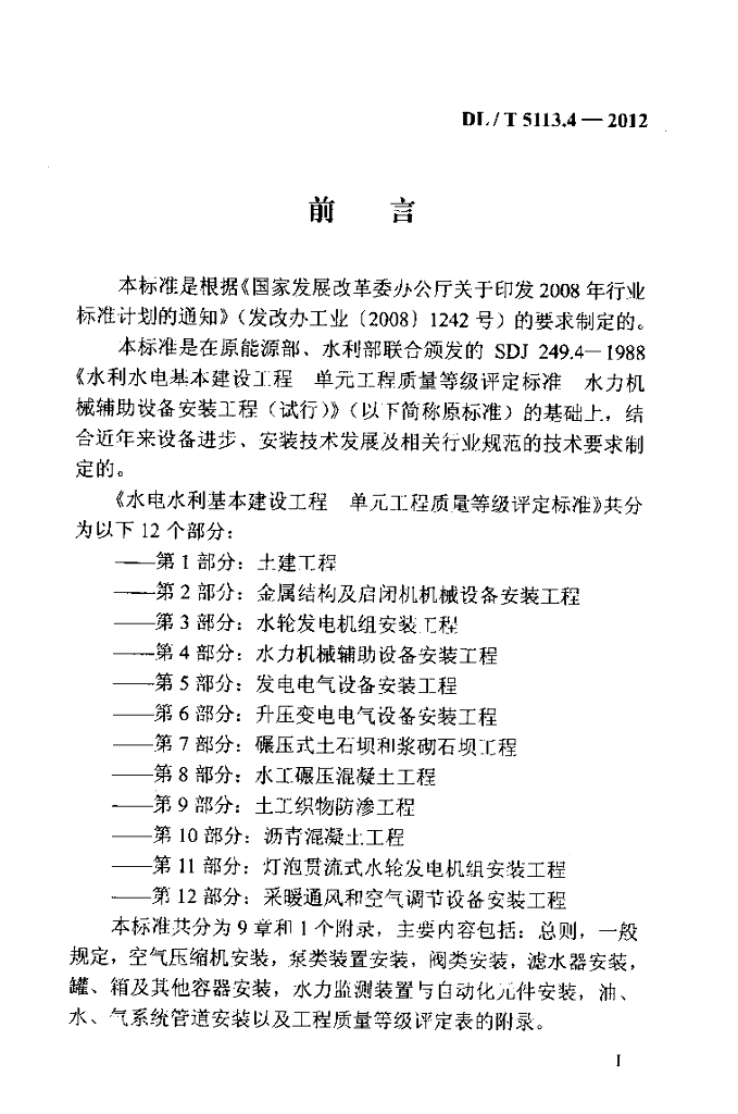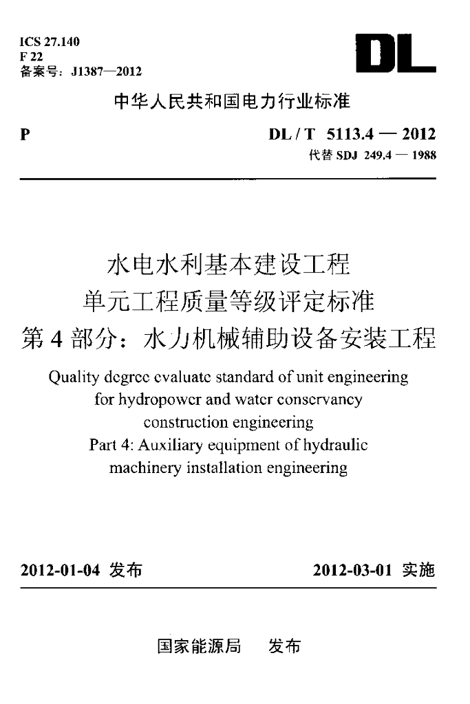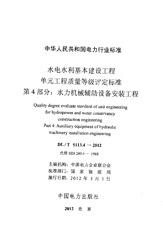 DL/T 5113.4-2012 水电水利基本建设工程 单元工程质量等级评定标准 第4部分:水力机械辅助设备安装工程