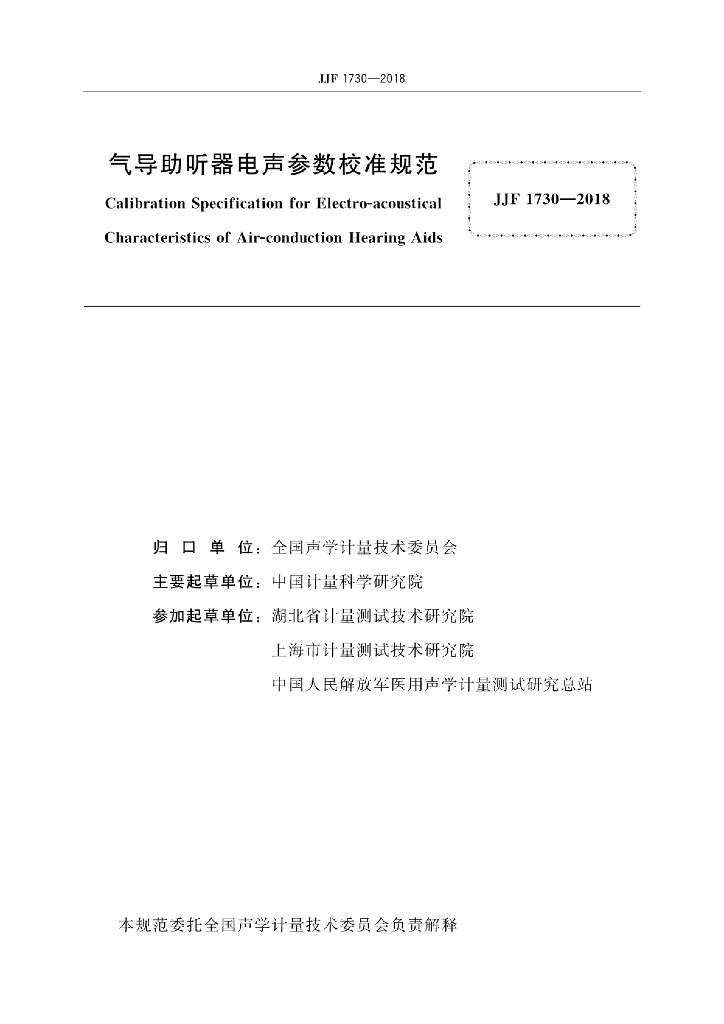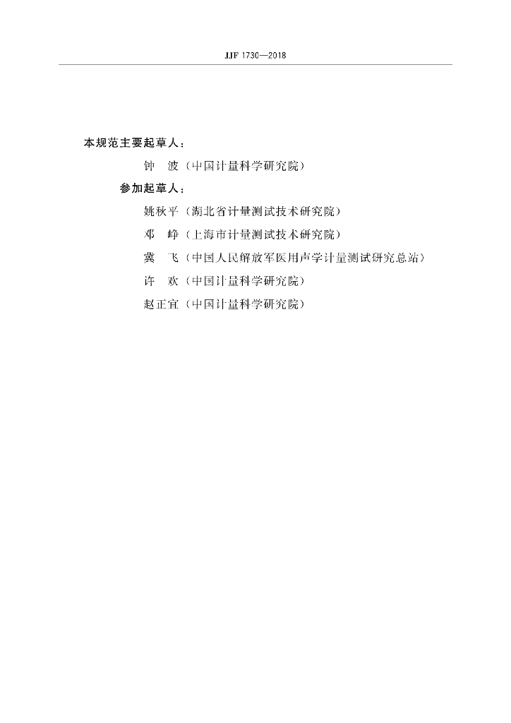 钟波(中国计量科学研究院)、姚秋平(湖北省计量测试技术研究院)、邓峥(上海市计量测试技术研究院)、冀飞(中国人民解放军医用声学计量测试研究总站)、许欢(中国计量科学研究院)、赵正宜(中国计量科学研究院)