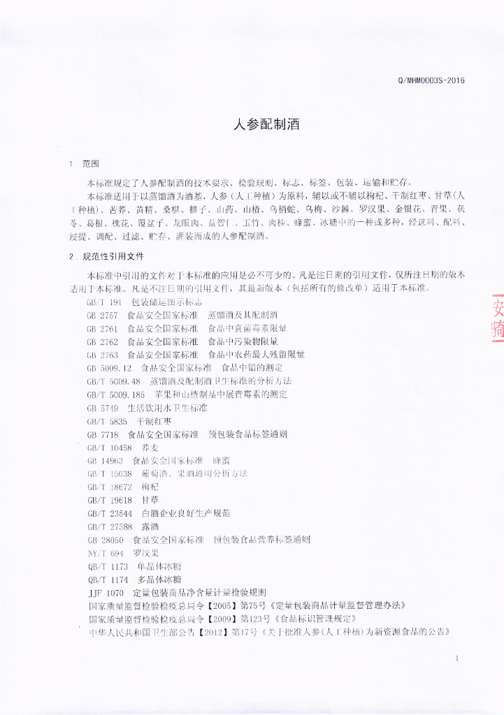 Q/MHM 0003S-2016 眉山市豪迈酒业有限公司 人参配制酒