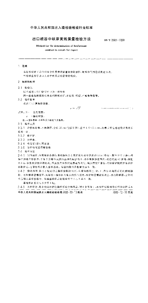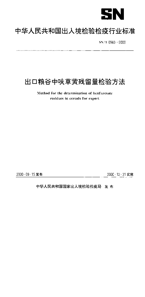 SN/T 0983-2000 出口粮谷中呋草黄残留量检验方法