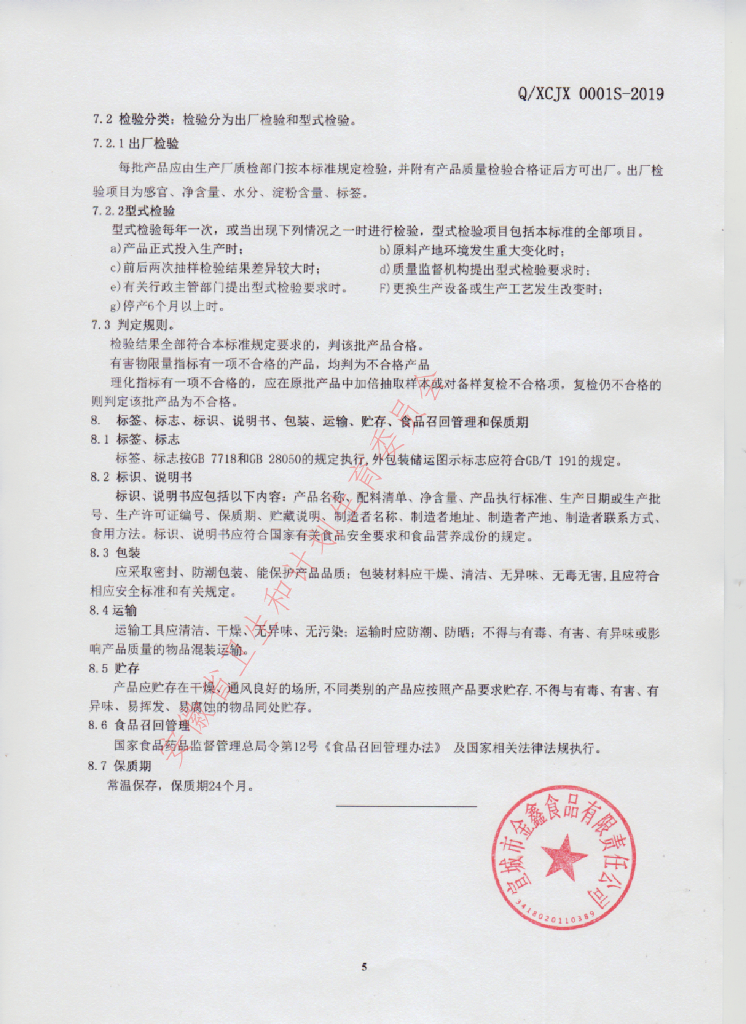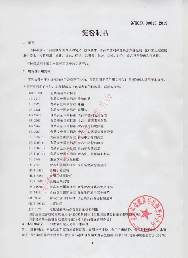Q/XCJX 0001S-2019 淀粉制品