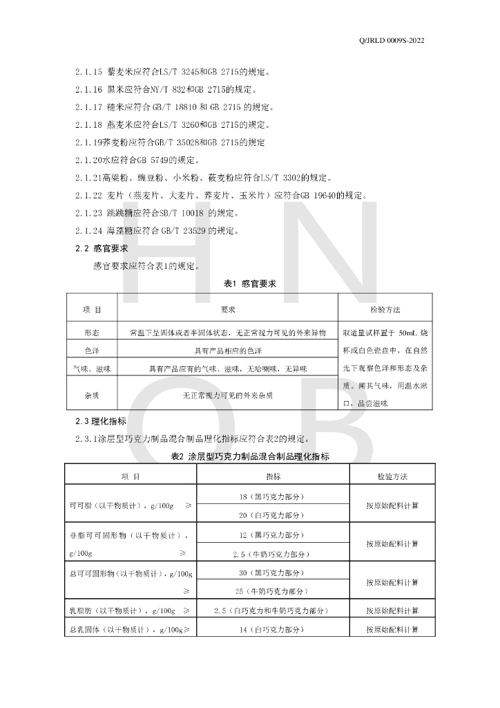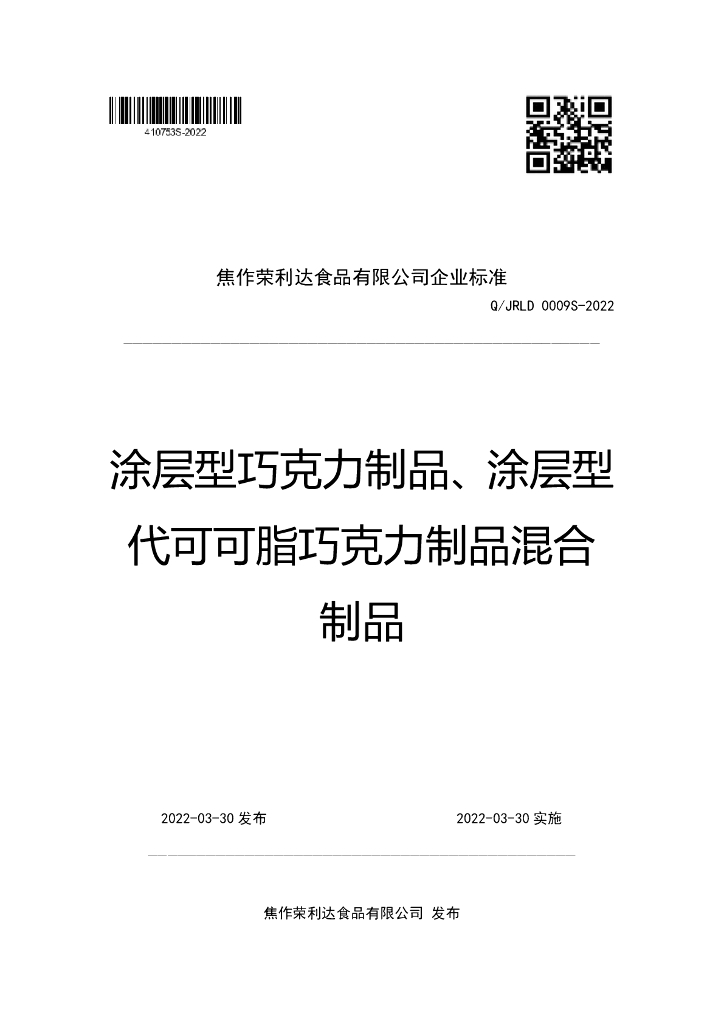 Q/JRLD 0009S-2022 涂层型巧克力制品、涂层型代可可脂巧克力制品混合制品
