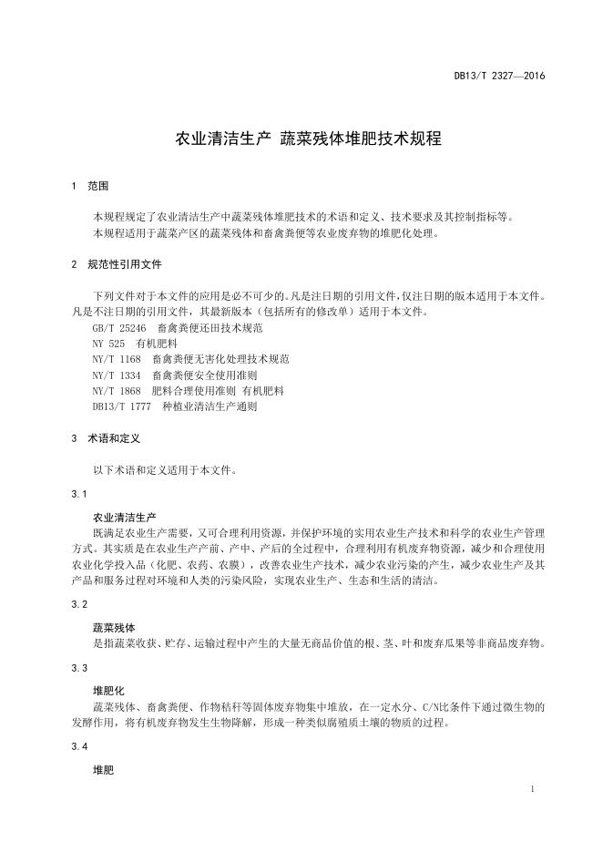 DB13/T 2327-2016 农业清洁生产 蔬菜残体堆肥技术规程