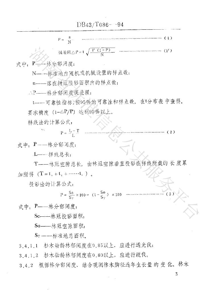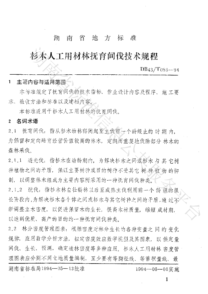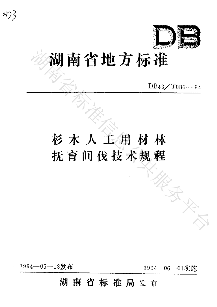 DB43/T 086-1994 杉木人工用材林 抚育间伐技术规程