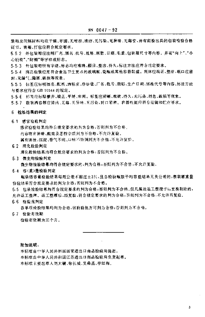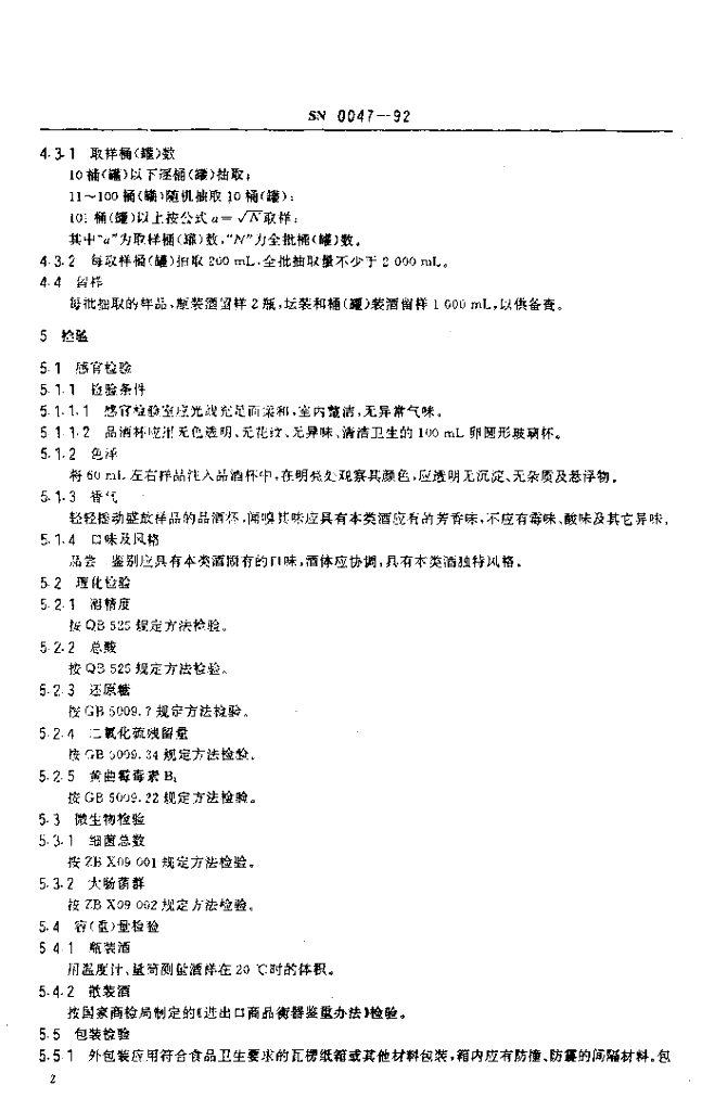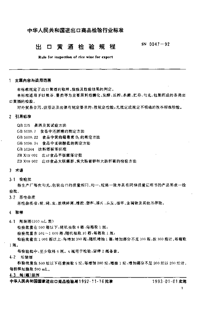 SN 0047-1992 出口黄酒检验规程